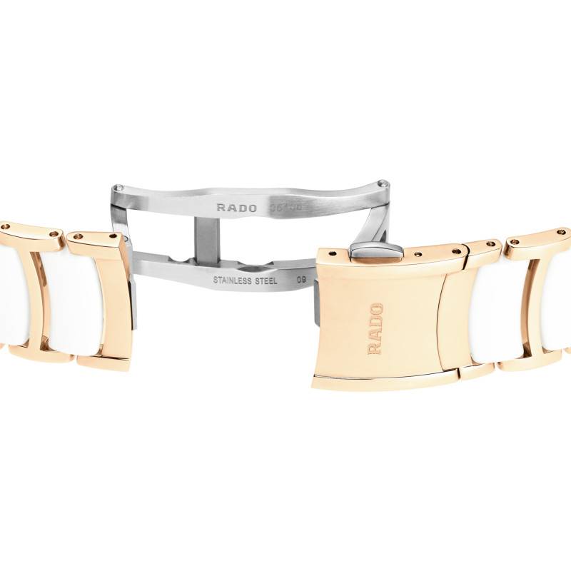 Le bracelet est une composition harmonieuse de céramique et acier inoxydable, sublimé par une finition PVD or rose. Cette association de matières propose une résistance optimale à l'usure tout en ajoutant une dimension esthétique moderne et luxueuse. La combinaison des couleurs blanc et rose se marie à la perfection avec le boîtier, créant une unité visuelle cohérente et raffinée. Il est fermé par une boucle déployante, assurant une sécurité et un ajustement parfaits sur le poignet.