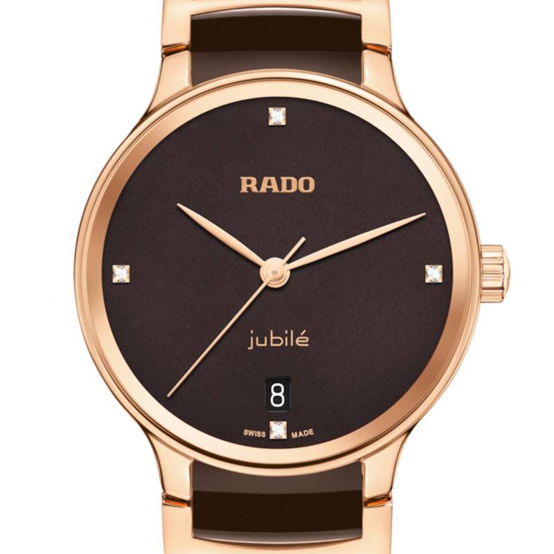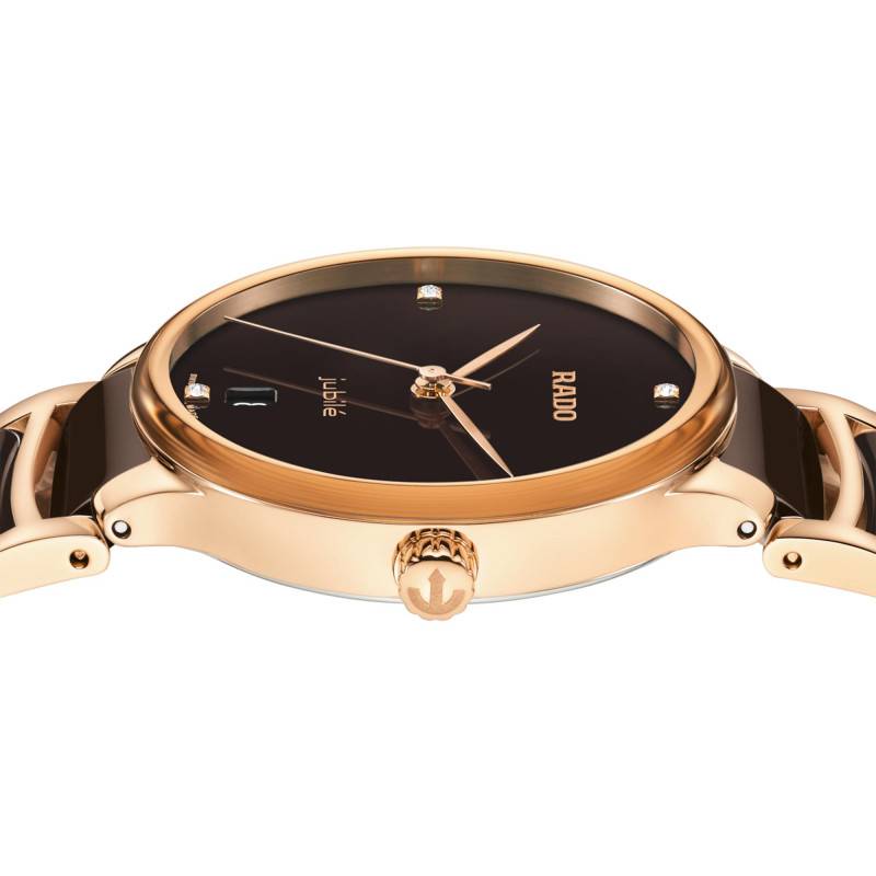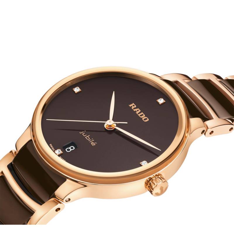 Le cadran de la Rado Centrix Diamonds est une œuvre d'art en lui-même, affichant une belle teinte marron avec une finition laquée qui lui confère une profondeur et une richesse visuelle incomparable. Les index en diamant ajoutent une touche d'élégance et de luxe, brillant subtilement à chaque mouvement du poignet. Le guichet date, positionné de manière expéditive à 6 heures, complète les fonctions pratiques de ce cadran tout en respectant un équilibre esthétique parfait.