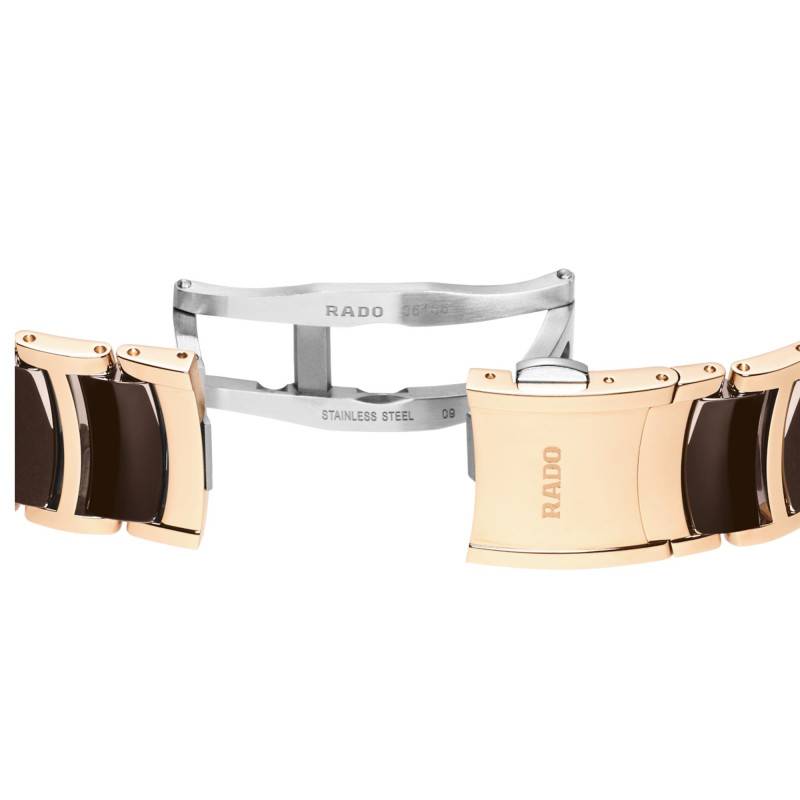 Le bracelet de la Rado Centrix Diamonds est une illustration de l'élégance moderne, fusionnant acier PVD or rose et céramique, conférant au garde-temps une allure unique et luxueuse. Sa couleur marron et rose se marie à la perfection avec le boîtier, créant une harmonie visuelle captivante. Confectionné avec une finition acier poli, il renferme une sophistication à la fois discrète et raffinée. Le bracelet est ajustable et est équipé d'une boucle déployante papillon, assurant une sécurité et une facilité d'utilisation au quotidien.