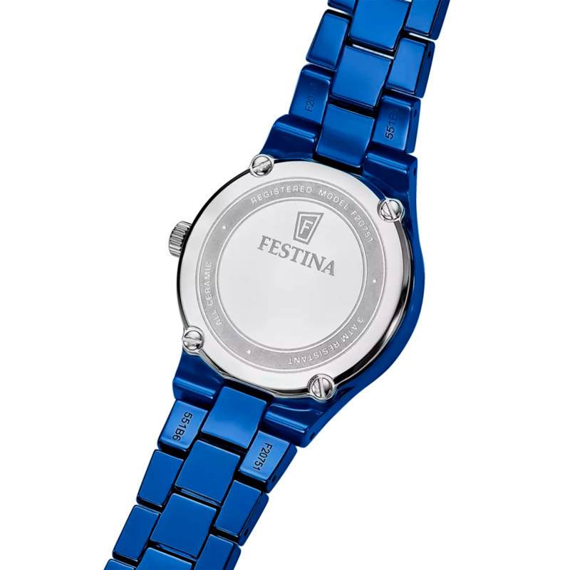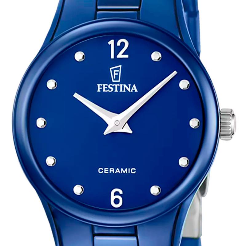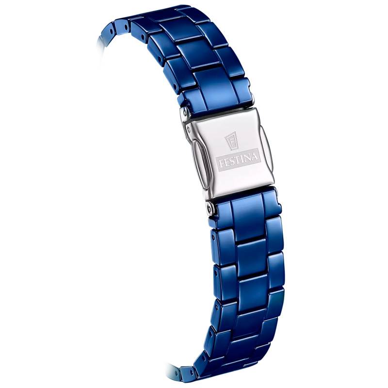 Le bracelet de cette montre Festina est, lui aussi, en céramique, matière connue pour sa résistance et son confort. Arborant un joli bleu, il complète harmonieusement l'ensemble de la montre. La boucle déployante garantit une fermeture sécurisée tout en permettant une manipulation facile.