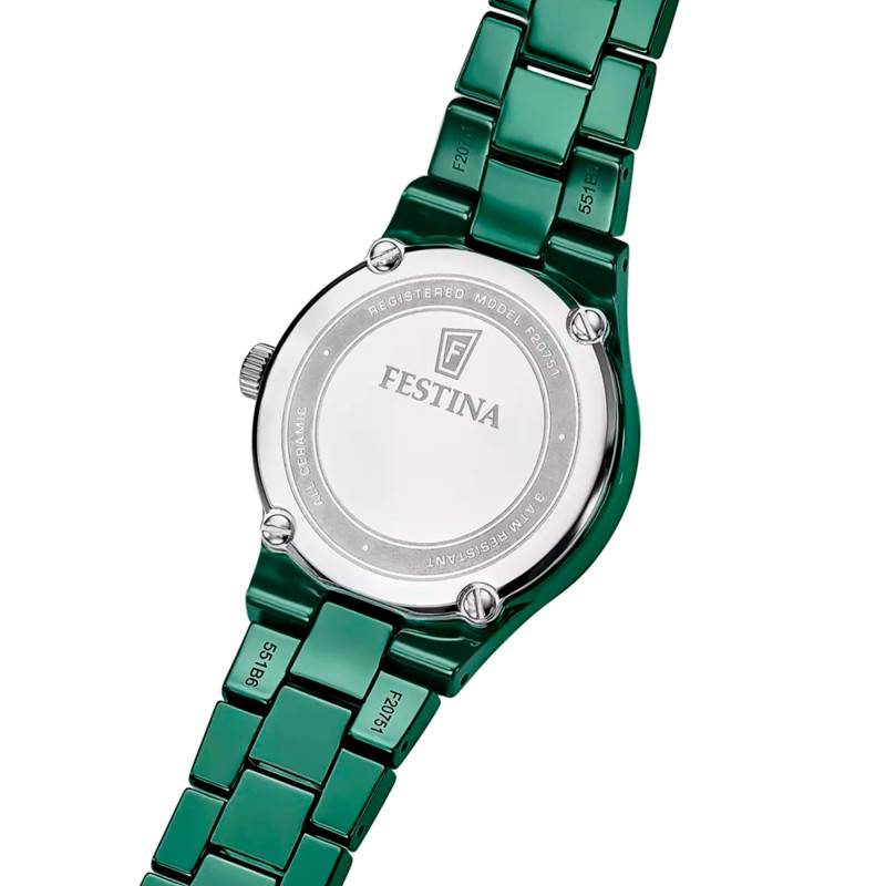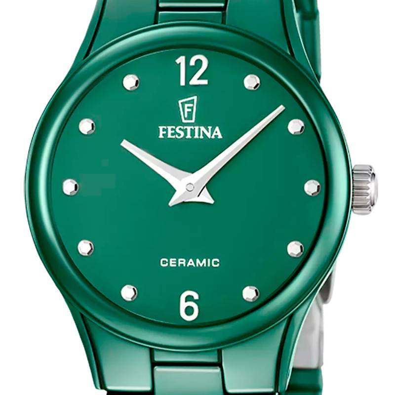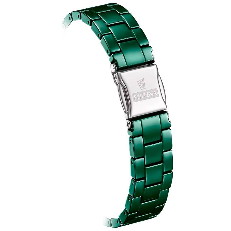 Le bracelet de cette montre Festina est d'une exquise élégance, conçu en céramique. Sa couleur verte, parfaitement assortie au cadran, renforce l'unicité de cette pièce. La céramique est reconnue pour sa durabilité et son toucher agréable qui, combinés à une boucle déployante, assurent sécurité et confort. La finition polie du bracelet ajoute une dimension de sophistication supplémentaire, captivant l'œil avec une brillance subtile.