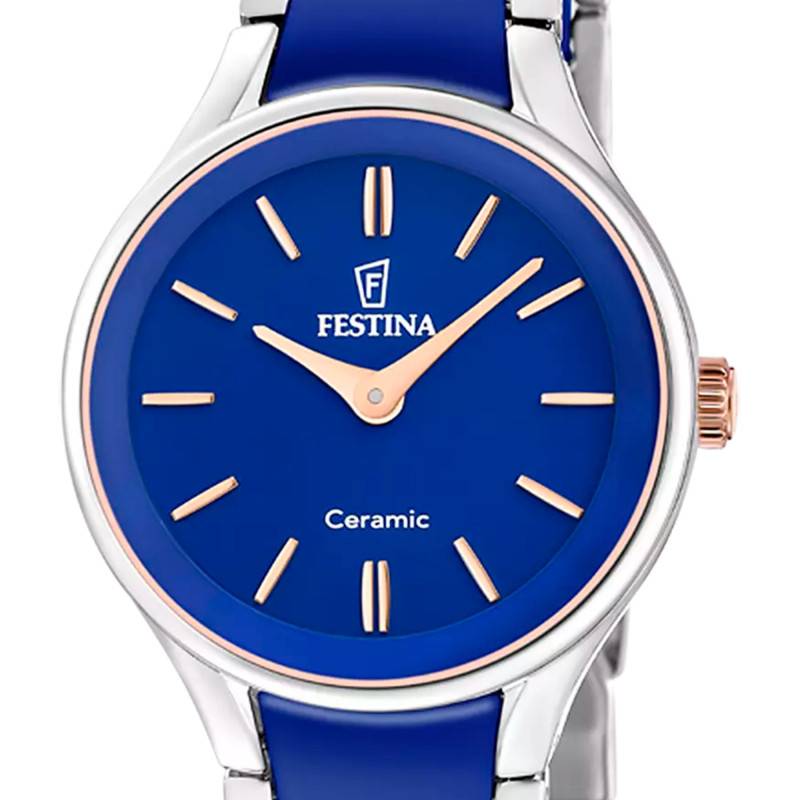 La montre Festina Ceramique pour femmes est une pièce d'horlogerie raffinée qui marie à la perfection modernité et élégance intemporelle. Son boîtier rond, réalisé en acier inoxydable avec une finition poli/brillante, attire immédiatement l'attention. Le poids léger de seulement 69,96 grammes rend cette montre confortable à porter tout au long de la journée sans compromettre sa robustesse et son allure haut de gamme. Le diamètre du boîtier est de 30,50 mm, accompagné d'une épaisseur de 8,15 mm, ce qui en fait un accessoire délicat parfaitement ajusté aux poignets féminins. La montre possède également un verre minéral, connu pour sa solidité et sa résistance aux rayures, qui protège le cadran tout en assurant une lisibilité parfaite sous toutes les conditions lumineuses. Cette montre est dotée d'une élégante lunette en céramique, conférant au modèle une touche de modernité grâce à sa couleur bleu vibrante. Le bouton remontoir unique sur le côté du boîtier permet une manipulation facile et intuitive pour le réglage de l'heure.