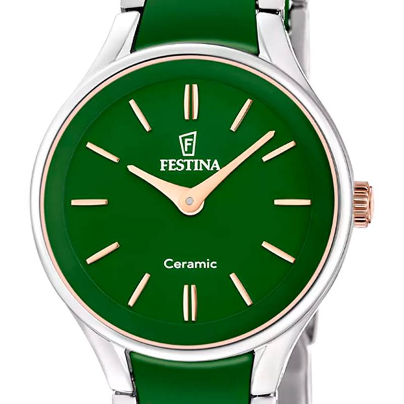Le cadran de cette montre Festina est l'incarnation même du raffinement grâce à sa teinte verte profonde qui contraste élégamment avec la couleur rosé des index et des aiguilles. Le cadran vert, minimaliste et sans surcharge, offre une lisibilité exceptionnelle tout en projetant une image de luxe moderne. La couronne de réglage, positionnée de manière classique, permet d'ajuster facilement l'heure. Le design en céramique de la lunette autour du cadran ajoute une sophistication supplémentaire, en harmonie avec le reste du garde-temps.