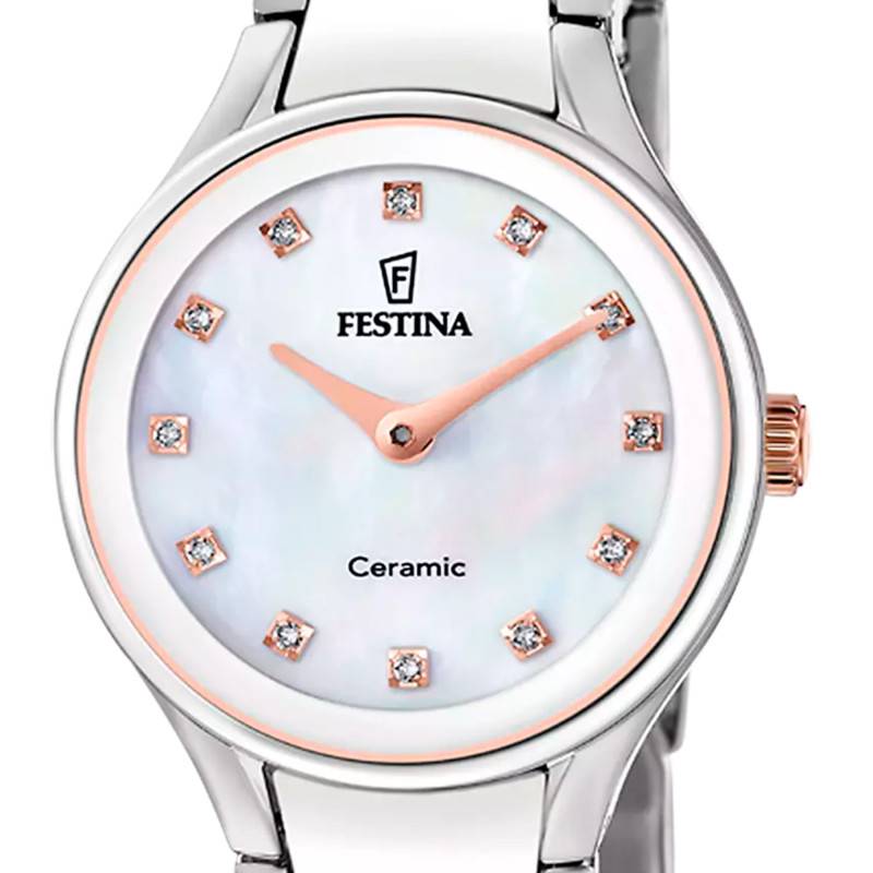 Le cadran de cette montre Festina présente une finition nacrée d'une grande finesse qui capte la lumière d'une manière opaque et luisante, apportant pureté et luxe. Les index en oxyde de zirconium ajoutent un éclat subtil, sans jamais compromettre la lisibilité. C'est un affichage analogique qui utilise des aiguilles pour indiquer les heures et minutes. Le choix du verre minéral pour protéger ce cadran nacré assure une clarté durable tout en offrant une certaine résistance aux rayures, un choix pragmatique et esthétiquement plaisant.