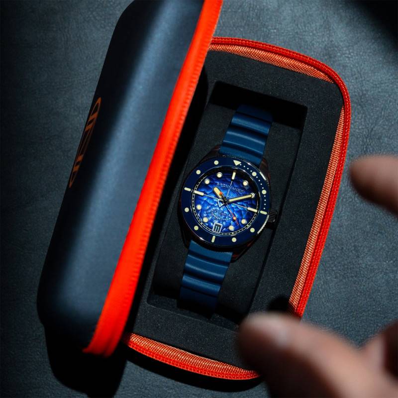 Le cadran est un véritable spectacle visuel. Proposant un bleu profond avec un motif Vagues, il évoque immédiatement l'immensité et la beauté de l'océan. Ce cadran séduisant est protégé par un verre saphir, connu pour sa résistance accrue aux rayures, et traité pour offrir une réduction optimale des reflets, garantissant ainsi une lisibilité sans faille même sous une lumière intense. Les aiguilles luminescentes ainsi que les index sont exceptionnellement visibles dans le noir, ce qui en fait un allié précieux lors de plongées en eaux profondes ou de conditions de faible luminosité. L'affichage comprend un chemin de fer, offrant non seulement une précision horaire, mais ajoutant aussi une réalisation esthétique plaisante. Le guichet de date positionné de manière élégante à 6 heures vient parfaire l'ensemble, apportant une touche pratique à un design déjà sophistiqué. Chaque élément du cadran a été soigneusement choisi pour offrir non seulement une expérience visuelle impressionnante, mais aussi un accès pratique et rapide aux informations essentielles.