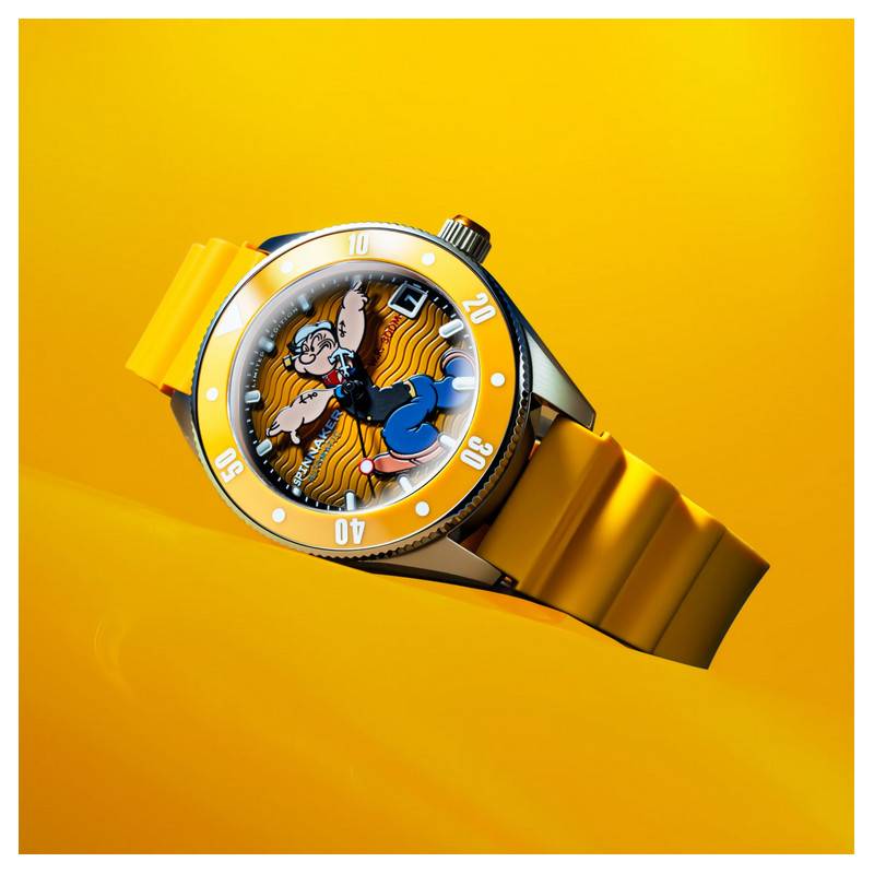 Le cadran jaune de la montre est sans conteste l'élément qui attire tous les regards. Son design incarne l'esprit audacieux de Popeye, positionné fièrement au centre, ses bras musclés servant d'aiguilles pour indiquer l'heure. Ce choix de conception rend chaque coup d'œil à votre poignet à la fois divertissant et fonctionnel. Les détails du cadran, avec ses motifs de vagues, ajoutent une profondeur visuelle fascinante qui rappelle les aventures marines du personnage. Les index luminescents assurent une lisibilité impeccable même dans les conditions de faible luminosité. De plus, un guichet date parfaitement intégré complète les fonctionnalités du cadran, tandis que le chemin de fer des minutes assure une précision accrue. Tout cela est protégé par un verre saphir bombé, reconnu pour sa résistance aux rayures et son traitement antireflets, qui garantit une visibilité parfaite sous tous les angles.
