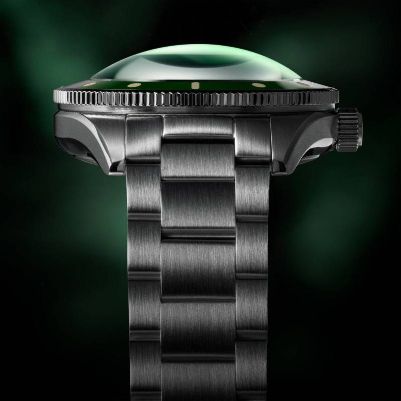 Le cadran séduit par sa finition verte aux motifs Vagues, évoquant une sensation de fluidité et de profondeur. Les aiguilles luminescentes et les index assurent une lisibilité optimale en toutes conditions, tandis que le guichet de date à 6 heures ajoute une fonction pratique au design. Les éléments d'affichage analogiques sont sublimés par un chemin de fer des minutes, garantissant une précision et une clarté accrue lors de la lecture de l'heure. La couleur vert profond du cadran contraste superbement avec les détails lumineux, créant un effet visuel spectaculaire.