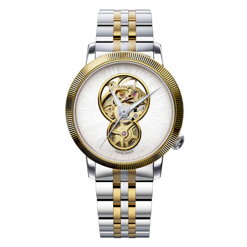 Le bracelet de la montre participe activement à son charme et à sa polyvalence. Confectionné en acier inoxydable 316L, il arbore également un traitement PVD gold, permettant une harmonie parfaite avec le boîtier bicolore. La couleur grise et jaune de ce bracelet renforce l'esthétique moderne et cohérente de la montre. Sa finition soignée combine des surfaces brossées et polies qui ajoutent du relief et de la profondeur visuelle à l'ensemble. Avec une largeur de 18 mm, ce bracelet s'attache solidement au poignet grâce à une boucle déployante papillon, un mécanisme de fixation sophistiqué et pratique qui assure une sécurité maximale et un confort d'utilisation optimal.