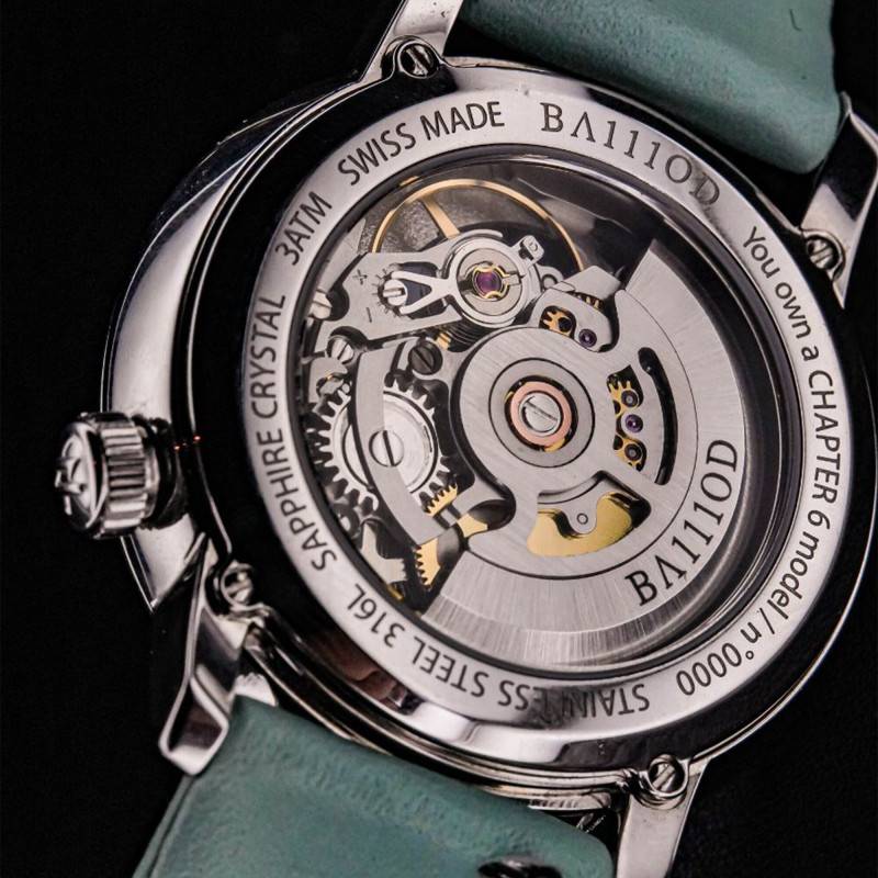 Au cœur de cette montre BA111OD Chapitre 6 se trouve un moteur d'une précision admirable et d'une fiabilité convaincante : le mouvement automatique suisse Soprod P024. Basé sur le célèbre ETA 2824-2, ce calibre garantit une performance sans égale grâce à sa fréquence de 28.800 A/h (4 Hz) et une réserve de marche de 38 heures. Ce mécanisme sophistiqué permet à la montre de fonctionner sans pile, se rechargeant automatiquement grâce aux mouvements du poignet, un atout écologique et économique unique. La montre offre ainsi les fonctions heures, minutes et secondes avec une précision impeccable, témoignant de l'expertise suisse en matière d'horlogerie. En somme, ce mouvement constitue le cœur même de la montre, offrant un battement constant et fiable tout en étant visible grâce au design squelette du cadran.