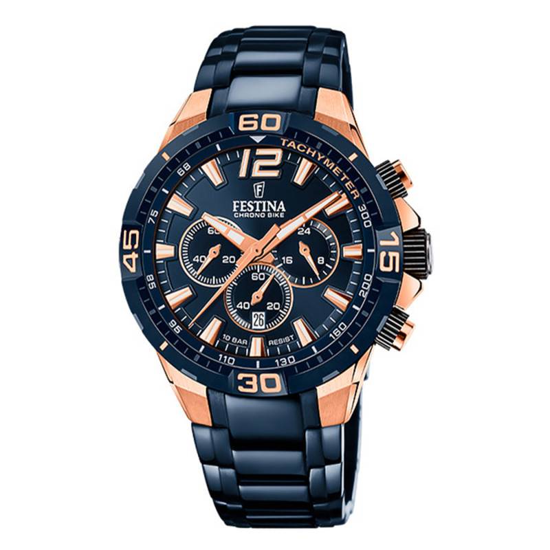 La maison Festina innove de nouveau dans la catégorie des montres à l'allure sportive et au design élégant. Cette marque, créée en 1902, aime innover dans le choix de ses matières et du design sportif de ses montres Chrono Bike. Elle fait désormais partie de son propre groupe : Festina Group. Ce modèle fait partie de la collection iconique engagée dans le cyclisme. Cette montre Chrono Bike 2020 vous séduira par son boîtier en acier inoxydable aux notes rosées et bleu foncé ainsi que ses fonctionnalités sportives. Son diamètre est de 44.5 millimètres, elle s'adresse plus particulièrement à la gent masculine. A droite du cadran se situe 2 boutons poussoirs et une couronne protégée. L'ensemble de ces éléments détient un design cranté apportant du relief au cadran. Ils sont utilisés respectivement pour actionner les compteurs et modifier l'heure lors de vos déplacements. Elle détient une lunette graduée par des chiffres arabes représentant 60 secondes ou 1 heure et vous permet d'atteindre plus facilement vos objectifs physiques. De plus, son fond de boîte vissé est surplombé par un verre minéral qui protégera votre cadran des chocs du quotidien. Enfin, ce modèle est doté d'une étanchéité vous assurant une protection jusqu'à 10 atmosphères.