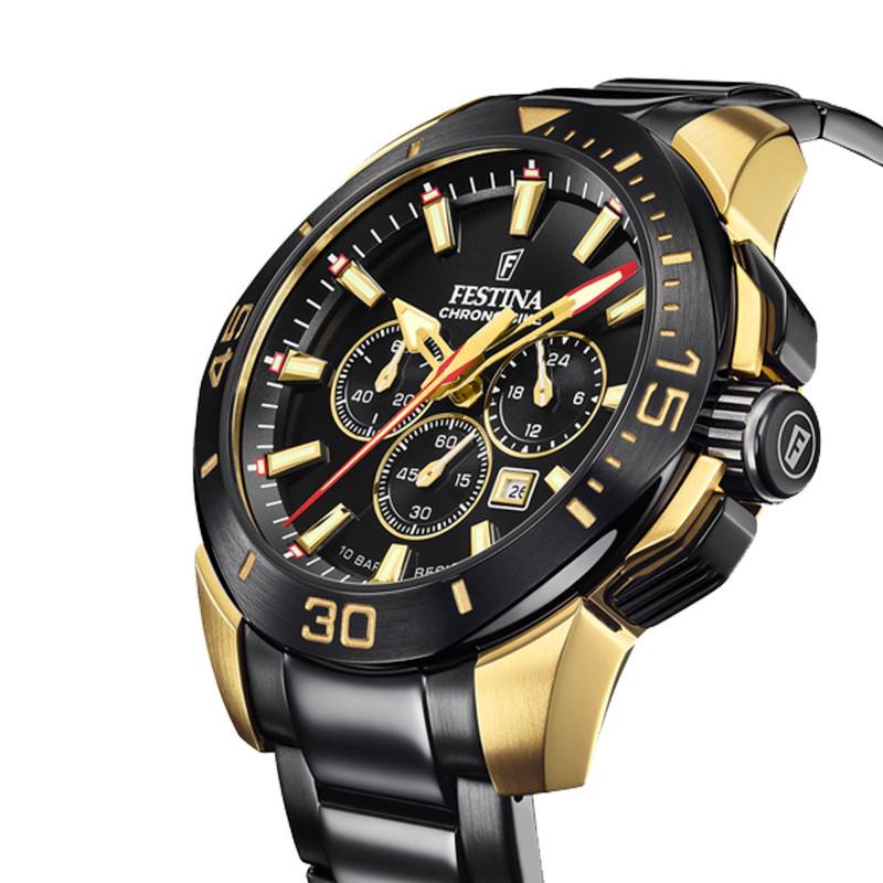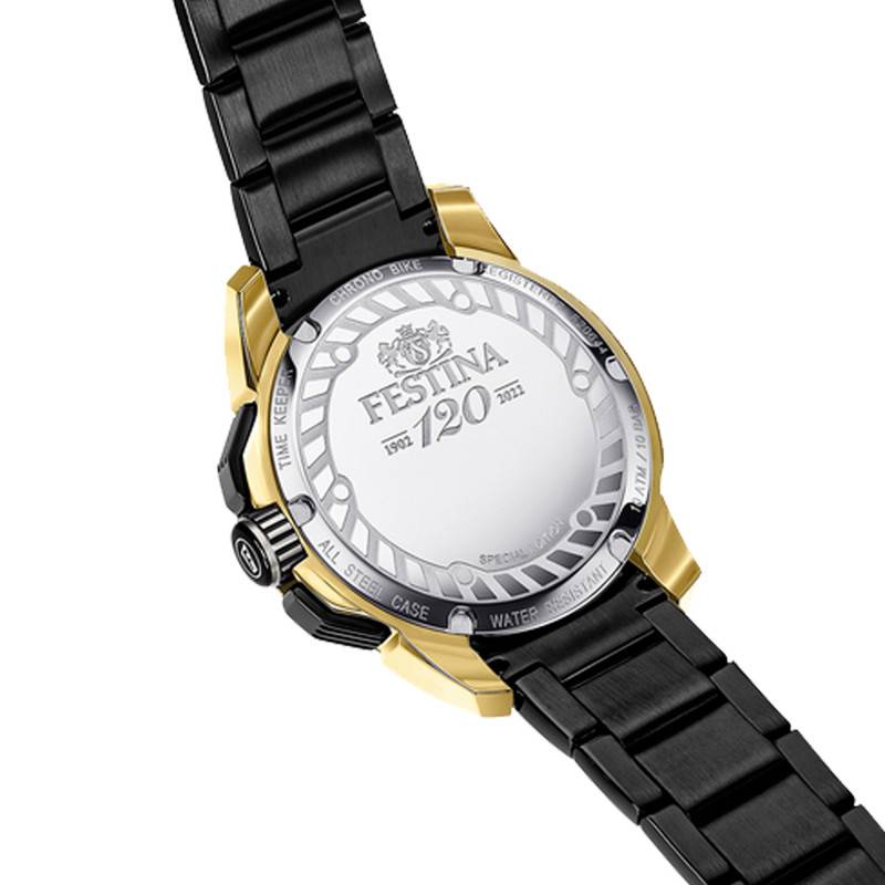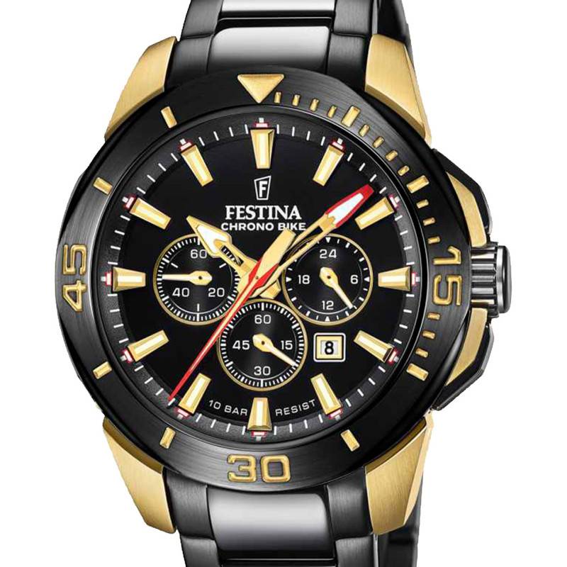 Les garde-temps Festina représentent sans aucun doute le mélange parfait entre tendance et sophistication. Introduite aujourd'hui par la marque, la montre F20644/1 est issue de la collection Chrono Bike. Elle présente un boîtier rond en acier inoxydable avec revêtement PVD jaune qui saura parer votre poignet. Ce dernier mesure 47 mm de diamètre. Un verre minéral entourée d'une lunette noire unidirectionnelle avec graduation de 15 en 15 préserve le beau cadran des dégâts éventuels. La couronne de réglage et les deux boutons poussoirs sont positionnés à 3 heures du cadran. Enfin, son fond vissé lui assure une résistance à l'eau de 10ATM.