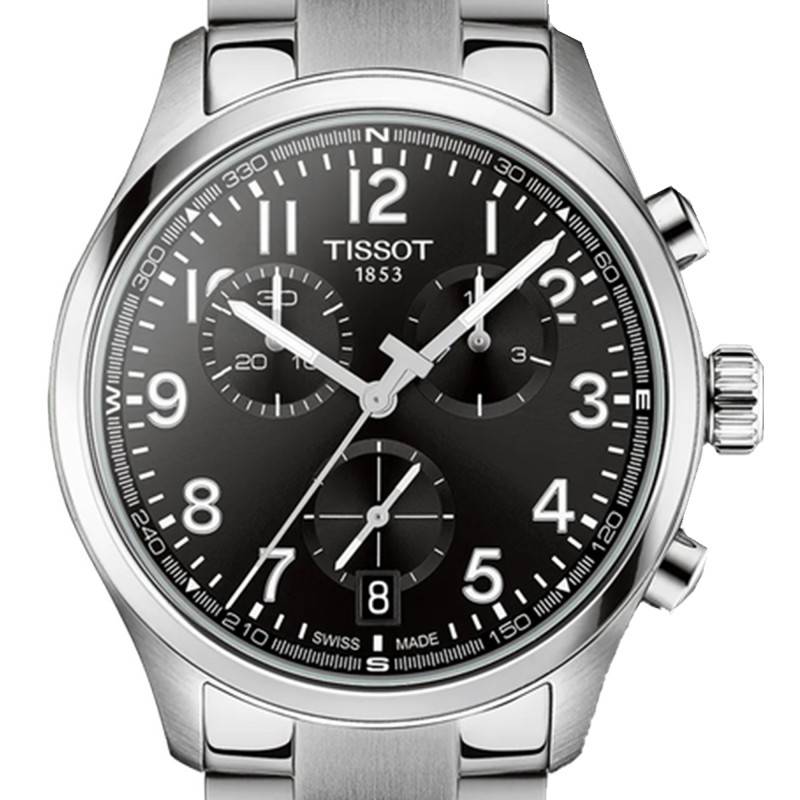 Le cadran de cette montre Tissot est un modèle de clarté et de fonctionnalité. Sa couleur noire rehaussée d'une finition soleillée offre un contraste parfait avec les chiffres arabes et les aiguilles luminescentes, tous habillés de SuperLuminova pour une lisibilité optimale dans l'obscurité. Les aiguilles indiquent les heures, minutes, et secondes avec une précision accrue. Le cadran intègre également trois compteurs additionnels pour les fonctions chronographiques, notamment un chronomètre au 1/10e de seconde. Un guichet de date est discrètement positionné à 4 heures, complétant harmonieusement l'ensemble.