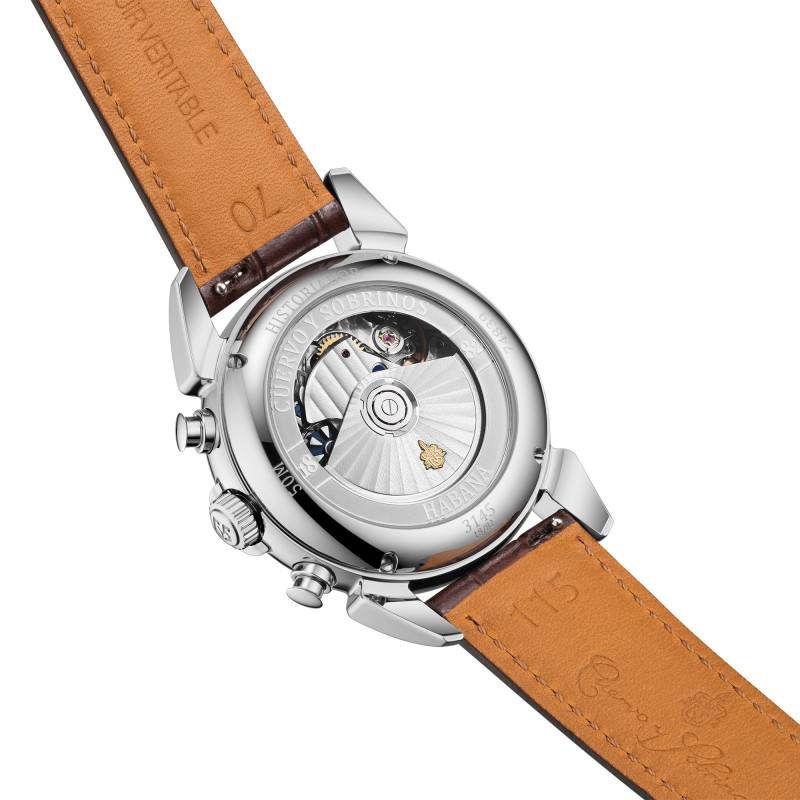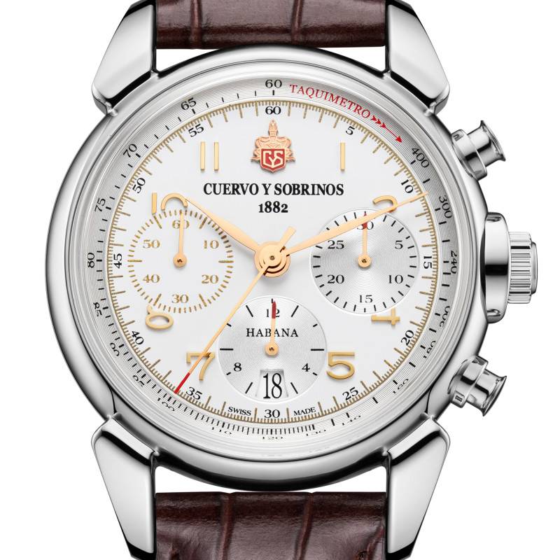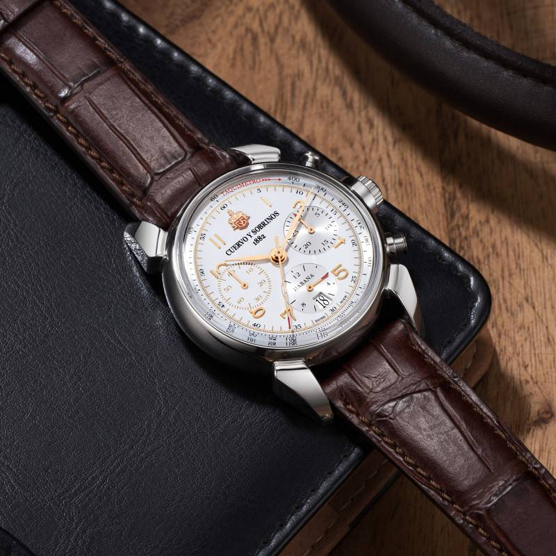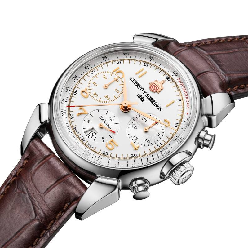 La montre Cuervo y Sobrinos Heritage Chronograph exprime une élégance intemporelle mêlée à une robustesse technique remarquable. Fabriqué en Suisse, son boîtier en acier inoxydable de forme ronde présente une allure raffinée et contemporaine. Avec un diamètre de 41 mm et une épaisseur de 15,25 mm, elle est conçue pour s'adapter confortablement au poignet tout en offrant une présence notable. Le fond de la montre est transparent et vissé, permettant une contemplation fascinante du mouvement interne grâce à un verre saphir résistant aux rayures. Ce verre, aux qualités optiques exceptionnelles, est également accompagné d'un traitement antireflets, garantissant ainsi une lecture claire de l'heure en toutes conditions. Avec ses lignes épurées et ses fonctionnalités avancées, cette montre répond parfaitement aux attentes des passionnés de chronométrie.