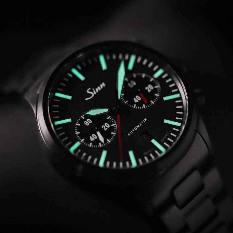 Le cadran de la Sinn Chronographe 936 S est un modèle de lisibilité et de style. Sur un fond mat noir, les chiffres arabes contrastent magnifiquement, contribuant à une lecture immédiate des heures, minutes et secondes. L'affichage analogique s'articule autour d'aiguilles luminescentes, garantissant une visibilité parfaite même dans l'obscurité. Deux compteurs additionnels, positionnés avec précision, offrent un chronométrage de 60 minutes et une petite seconde, en faisant un outil utile pour les amateurs de précision. Le verre saphir avec traitement antireflet protège ce cadran minimaliste et design, le rendant non seulement fonctionnel, mais également résistant aux rayures.