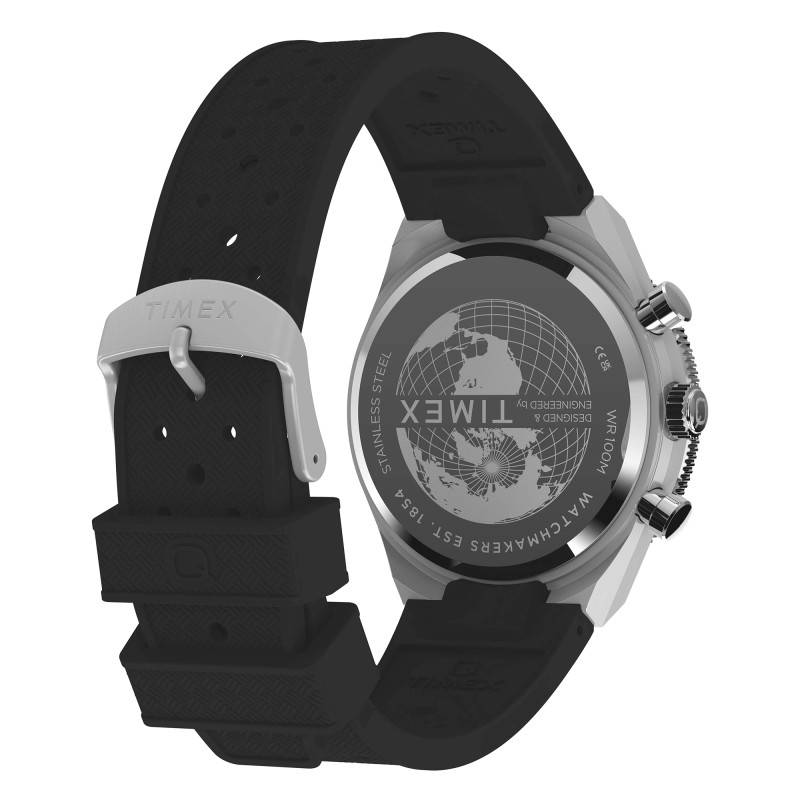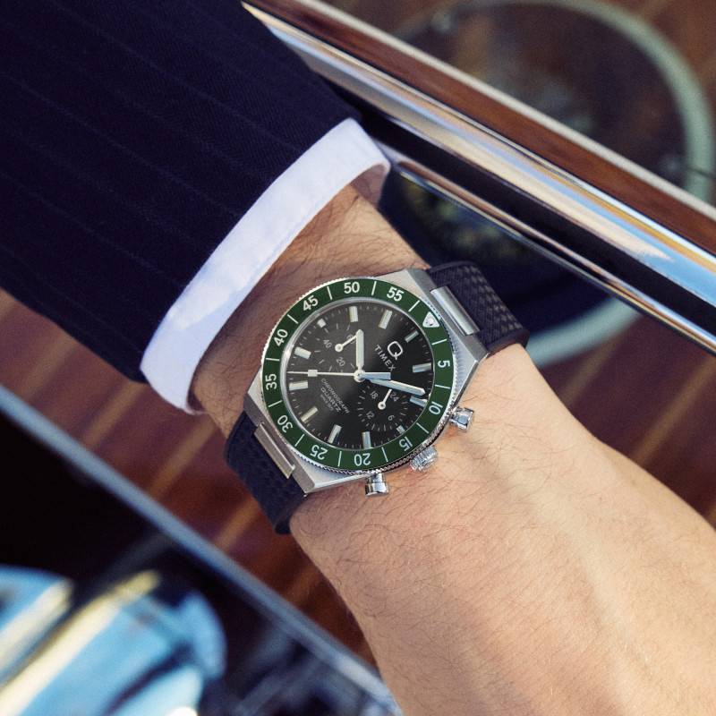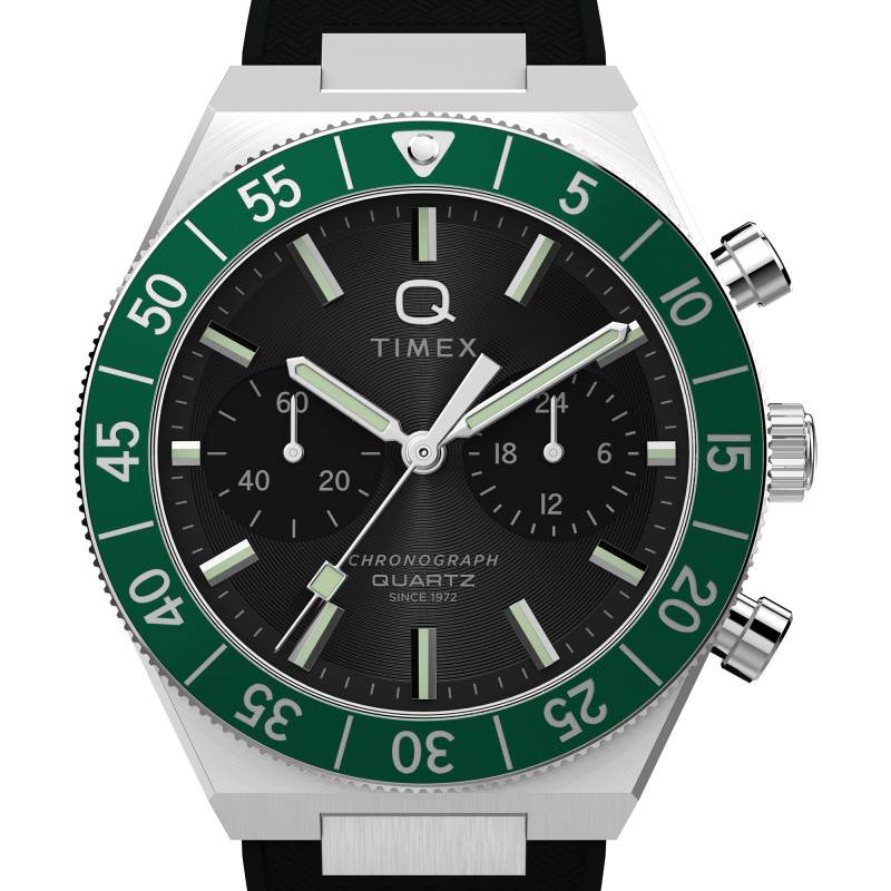 La montre chronographe Q Timex Continental se distingue par son élégance robuste et son design. Fabriquée dans un acier inoxydable, elle atteint un juste équilibre entre solidité et finesse grâce à son boîtier rond aux dimensions de 40 mm de diamètre et de 10 mm d'épaisseur. La combinaison des finitions, à la fois brossées et polies, lui confère une esthétique raffinée et contemporaine. Le poids total de 86 g assure une présence marquante au poignet sans alourdir. Un verre minéral plat protège ce garde-temps, offrant à la fois une vue claire sur le cadran et une résistance adéquate. Sa lunette, rotative unidirectionnelle et habillée d'un surprenant vert, apporte à la montre une dimension sportive et fonctionnelle.