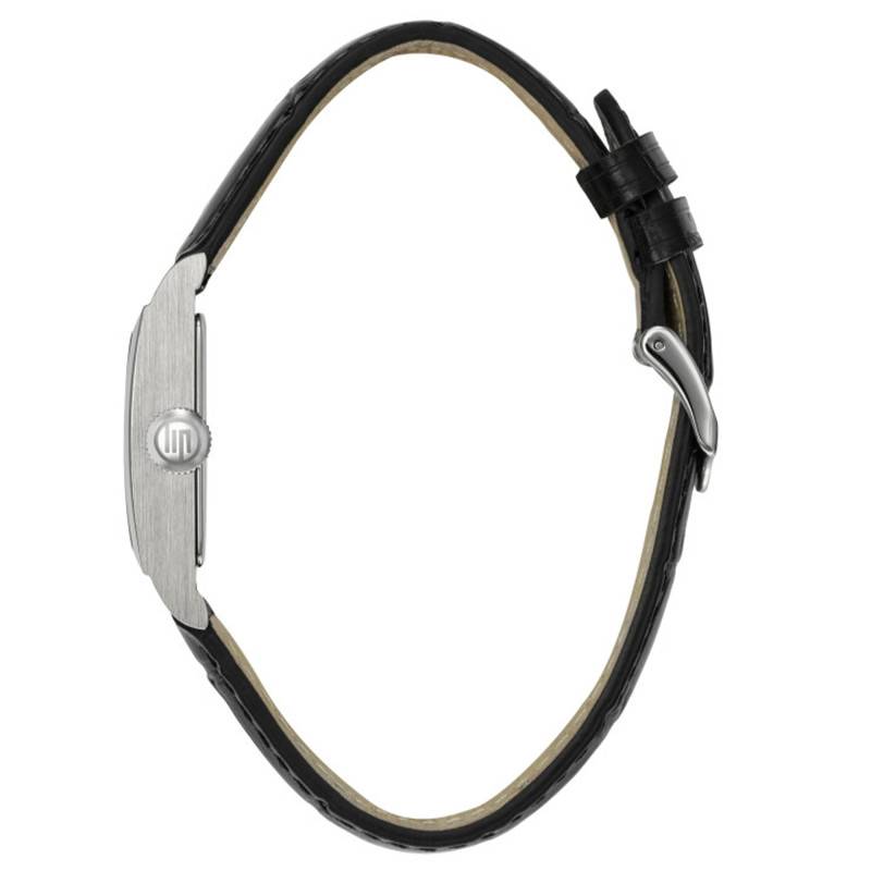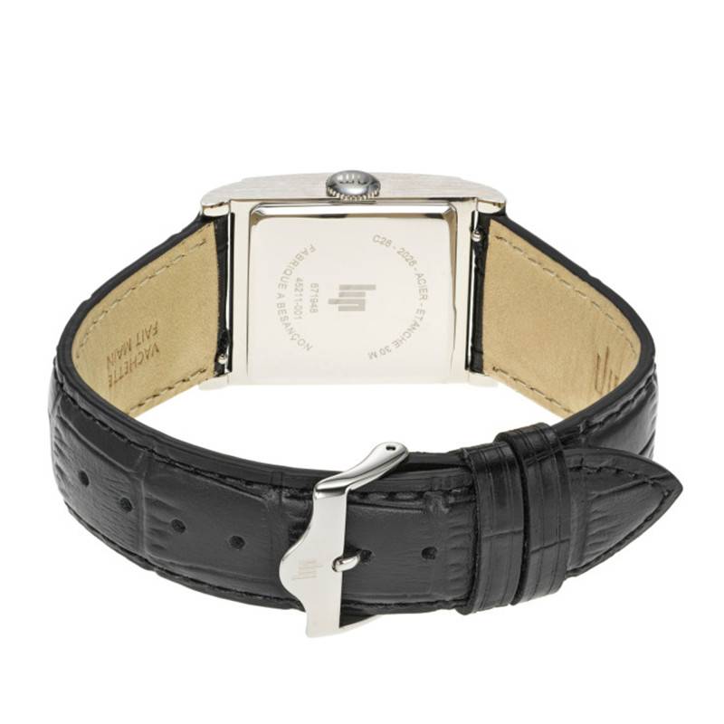 Le bracelet de la Lip Churchill est réalisé en cuir de bovin noir, magnifiquement travaillé pour imiter les textures riches et luxueuses du motif crocodile. Cette matière noble souhaite allier confort et durabilité raffinée. D'une largeur de 22 mm à l'entrecorne, il enveloppe subtilement le poignet, offrant une sensation agréable et sécurisante. Des surpiqûres discrètes soulignent l'attention portée aux détails et à la perfection du design. Le bracelet est fixé par une boucle ardillon classique, simple à manipuler, renforçant le style intemporel de l'ensemble.