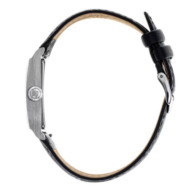 C'est un bracelet en cuir de vachette au motif de crocodile qui accompagne ce modèle pour assurer non seulement un élégant rendu, mais aussi un confort inégalé au poignet. Longé par des surpiqûres, il affiche une teinte noire qui saura s'accorder à votre style. Avec une largeur d'entre-corne de 18 mm, ce dernier est équipé d'une boucle ardillon argentée qui permet son maintien.