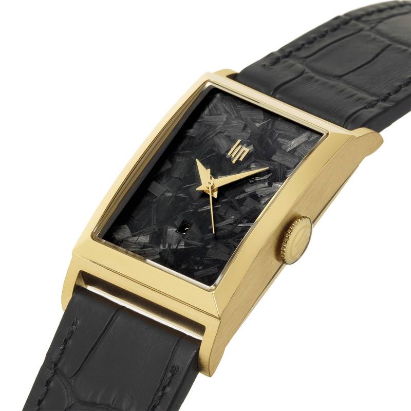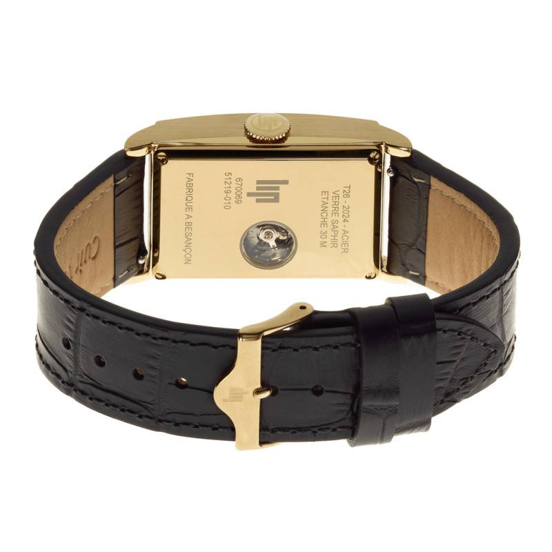 Ce modèle, fabriqué en France, présente un boîtier en acier inoxydable 316L avec revêtement PVD jaune. Le boîtier est de forme rectangulaire et mesure 46 mm de long et 26 mm de large, une dimension qui en fait une montre à la fois prestigieuse et confortable à porter pour un poignet masculin. Le fond du boitier, maintenu par des vis, présente une petite ouverture permettant de distinguer le mouvement.