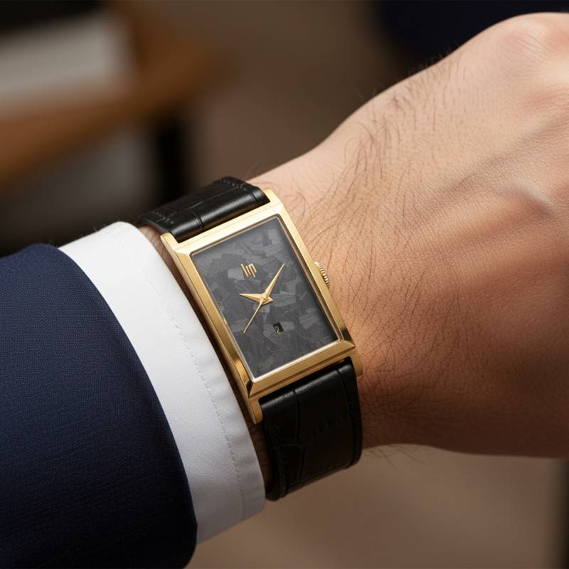 Le bracelet de cette montre Lip x Ocarat est en cuir de vachette, arborant un motif crocodile qui rehausse son style luxueux. De couleur noire, il est à la fois élégant et intemporel, s'harmonisant parfaitement avec le boîtier jaune de la montre. Le bracelet mesure 22 mm de largeur, assurant une présence affirmée au poignet tout en garantissant un confort inégalable. Il se ferme grâce à une boucle ardillon classique qui contribue à la sécurité et à la facilité d'utilisation.