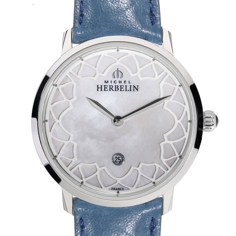 Un cadran digne des milles et unes nuits. Une magnifique arabesque de couleur grise se place sur le cadran à la place des index. De couleur grise elle se marie parfaitement avec la lunette. Une petite partie d'orient en France. Des petits points discrets font office d'index et sont placés sur le pourtour du cadran. A 6h se trouve un guichet date, chiffre noir sur fond blanc. Ce cadran témoigne de l'exigence du design au sein de la maison Michel Herbelin. Enfin, sous l'index de 12h se trouve le logo ainsi que le nom de la marque.
