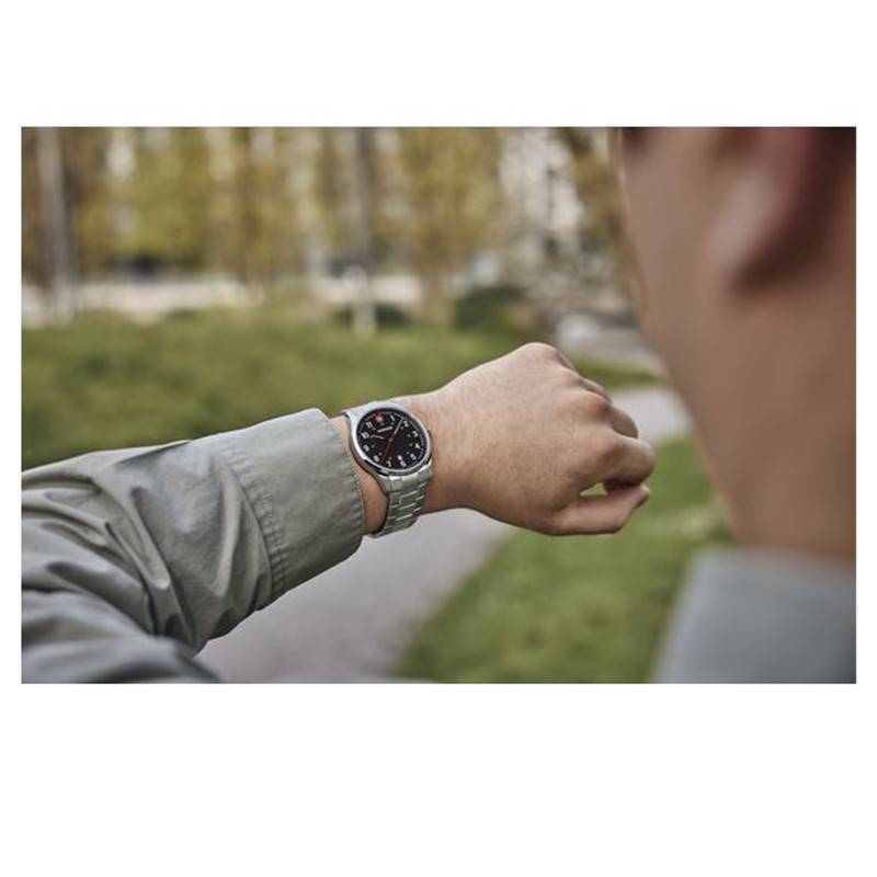 Agréable à voir, le cadran de cette montre vous communiquera le temps avec facilité. Il arbore une base de couleur noir mat qui contraste harmonieusement avec l'ensemble des éléments et permet une lecture lisible. Le pourtour est souligné par un minutieux chemin de fer des minutes marqué par des graduations blanches et ponctué par des chiffres arabes rouges de 05 à 60. Ce dernier entoure des chiffres arabes volumineux de couleur blanche marquant les heures sauf pour l'index de 12 heures qui est un carré rouge portant la croix suisse. Pour plus d'aisance lors de la lecture, les heures de 13 à 24 heures y sont affichées dans une ravissante teinte jaune contrastant à merveille avec le reste des marqueurs. Ces indicateurs temporels seront pointés deux aiguilles bâtons remplies de Super-LumiNova® alors que la trotteuse fine est colorée en rouge. Un guichet placé au-dessus de 6 heures vous communiquera la date et pour clore ce cadran en beauté, la marque note son nom en dessous de 12 heures et mentionne l'origine du modèle vers le bas du cadran.