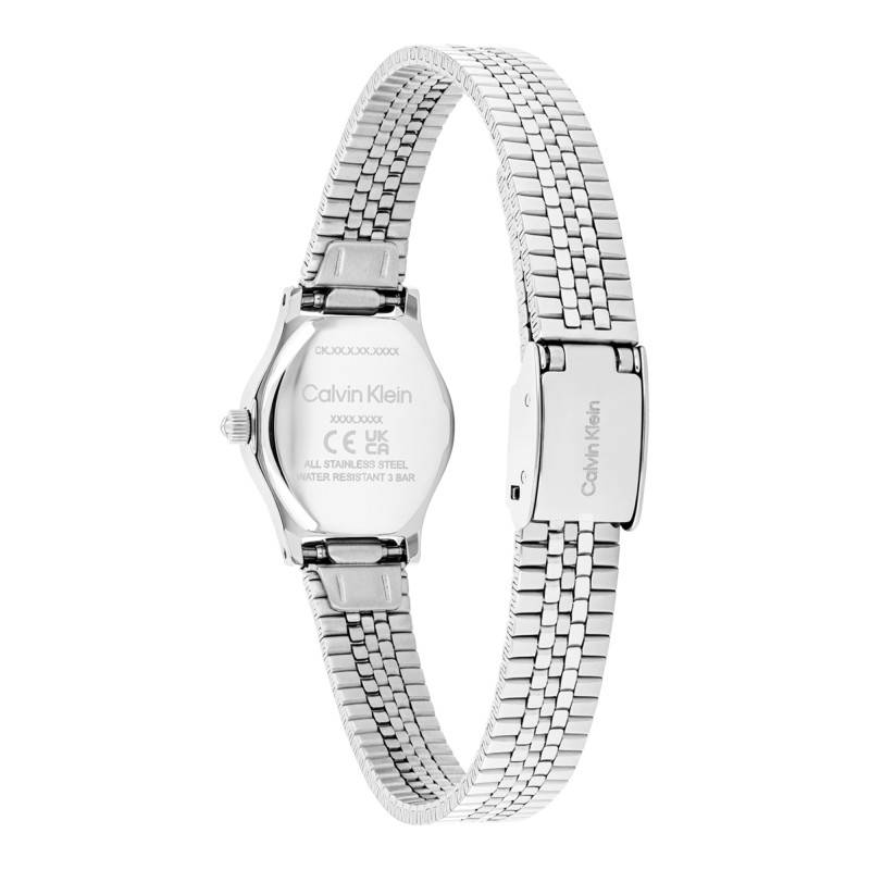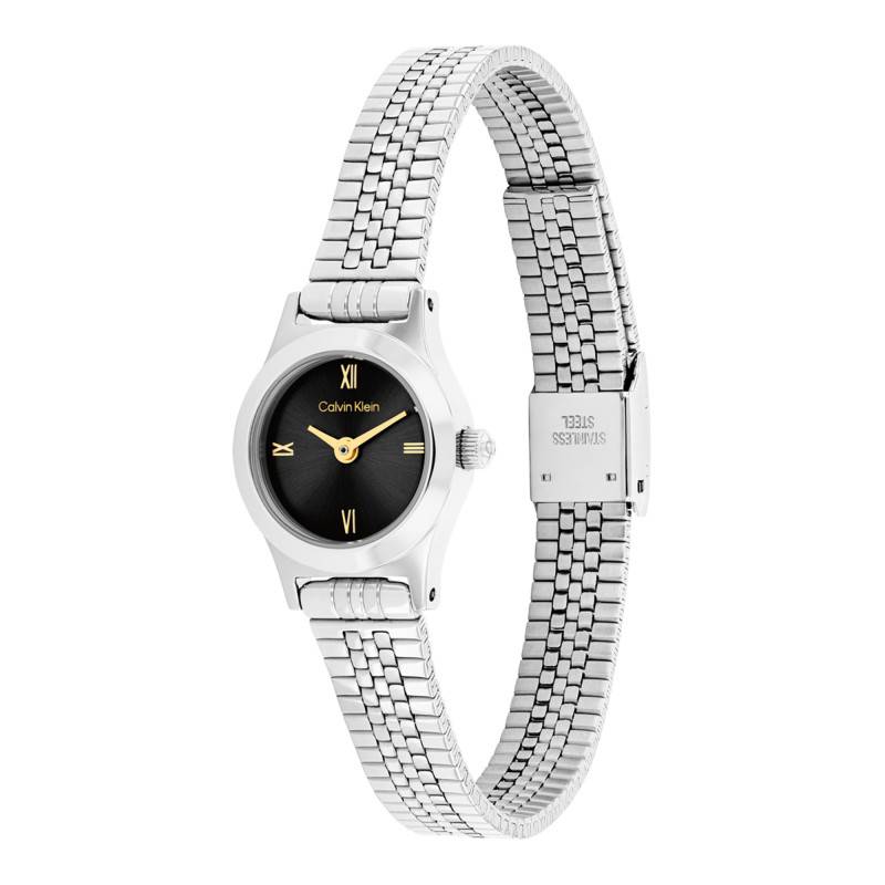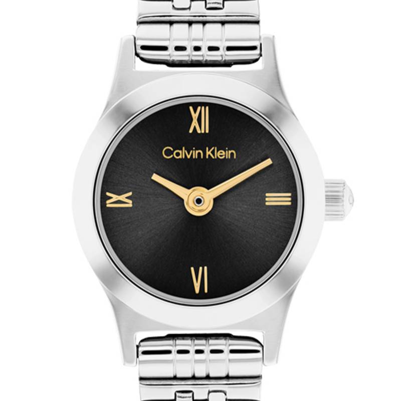 Le cadran constitue le cœur visuel de cette montre, et chez Calvin Klein, il est conçu pour captiver. Le cadran noir brillant est sublimé par une finition soleillée qui capte la lumière de façon exceptionnelle, créant des reflets qui ajoutent du dynamisme à chaque regard posé sur lui. L’affichage des heures s'effectue via des élégants chiffres romains, instaurant un contraste raffiné avec le fond sombre. Ce design est à la fois un hommage aux valeurs classiques de l'horlogerie et une déclaration de modernité. Les aiguilles, soigneusement façonnées, offrent une lecture claire et précise des heures et minutes, tout en se mouvant sous la protection sécurisante du verre minéral plat.