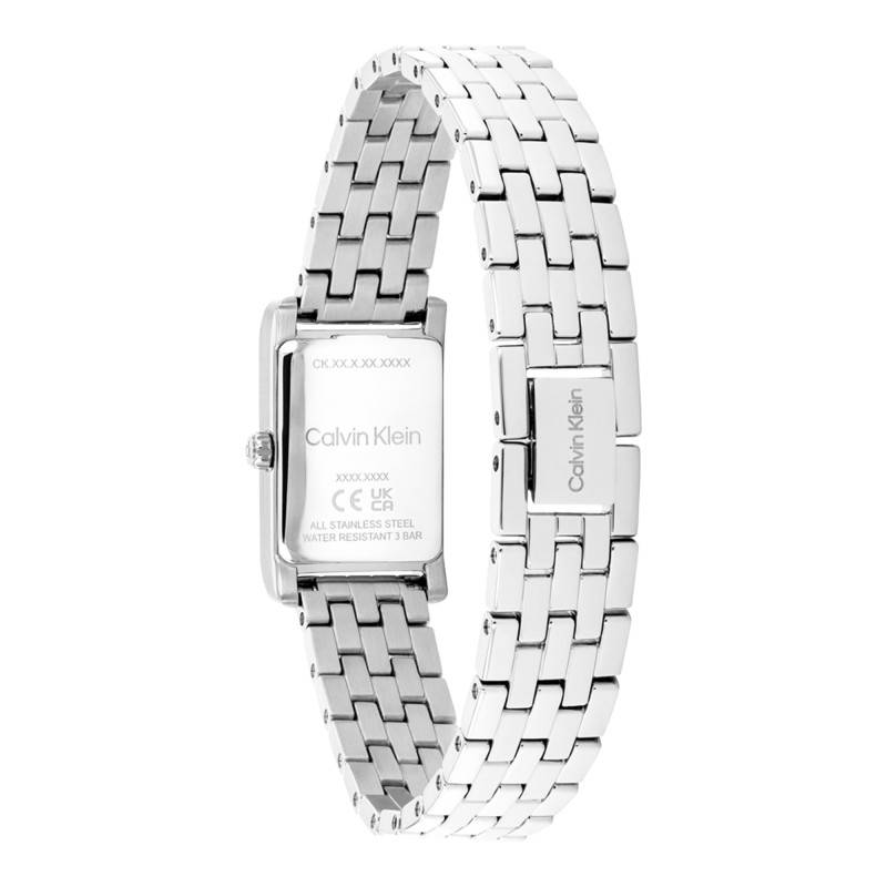 Cette superbe montre pour femme de la marque Calvin Klein se distingue par son allure à la fois moderne et élégante. Le boîtier au design rectangulaire est confectionné en acier inoxydable, un matériau reconnu pour sa solidité et sa résistance à la corrosion, conférant à l’ensemble une longévité exceptionnelle. Son diamètre modeste de 16 mm et son épaisseur de 6 mm font de ce bijou horloger une pièce discrète et délicate, parfaite pour habiller le poignet sans l’encombrer. Le poids de 41 g en fait une montre légère qui se porte avec aisance tout au long de la journée. Le fond de la montre est emboîté, apportant ainsi une touche de finition soignée tout en protégeant efficacement le mécanisme interne.