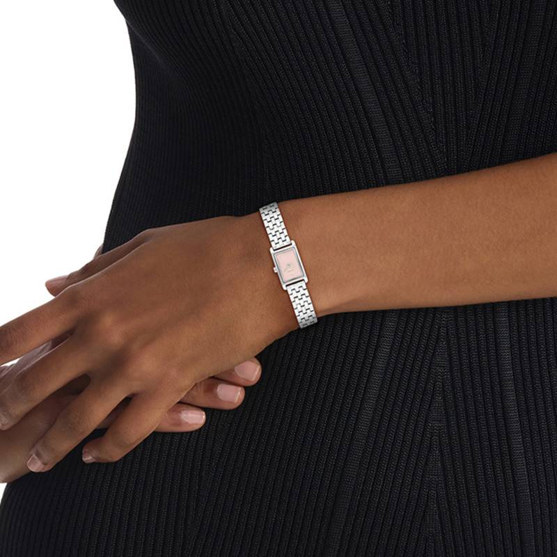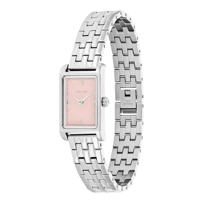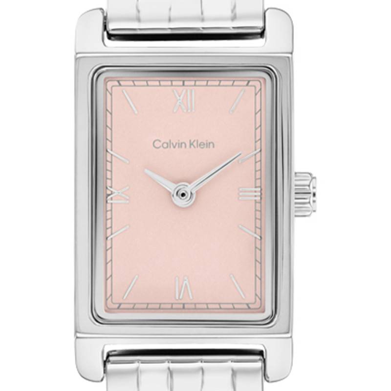 Le cadran de cette montre Calvin Klein capte immédiatement l’attention avec son fond rose, une teinte douce et féminine qui se marie harmonieusement avec le boîtier gris. Ce subtil contraste est accentué par l’utilisation de chiffres romains, essentiels pour un affichage classique et élégant. Les index en acier et le chemin de fer des minutes ajoutent une touche de sophistication, assurant une lisibilité parfaite en toutes circonstances. Le verre plat, simple mais efficace, protège l’ensemble des éventuelles rayures et autres dommages possibles.
