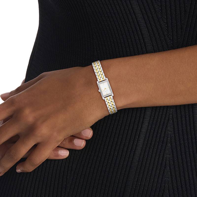 Le bracelet est une véritable déclaration de style, mêlant l'acier inoxydable aux finitions polies dans une combinaison harmonieuse de gris et jaune. Ce design bicolore confère à la montre une allure à la fois chic et versatile, idéale pour toutes les occasions. La largeur et la conception du bracelet assurent un confort optimal, tandis que la fermeture à boucle déployante offre une sécurité supplémentaire par son système de fermeture intuitive et fiable.