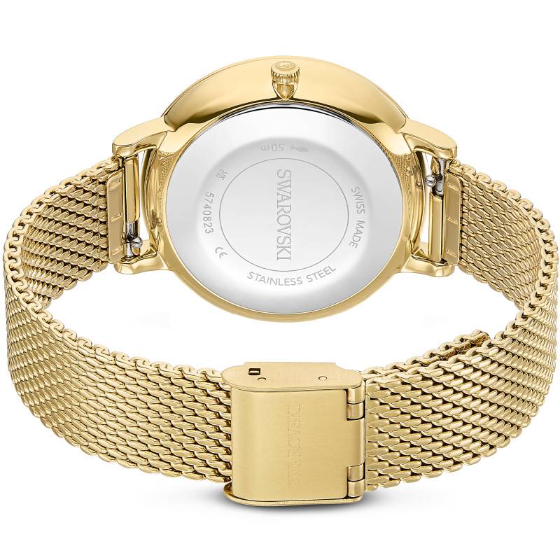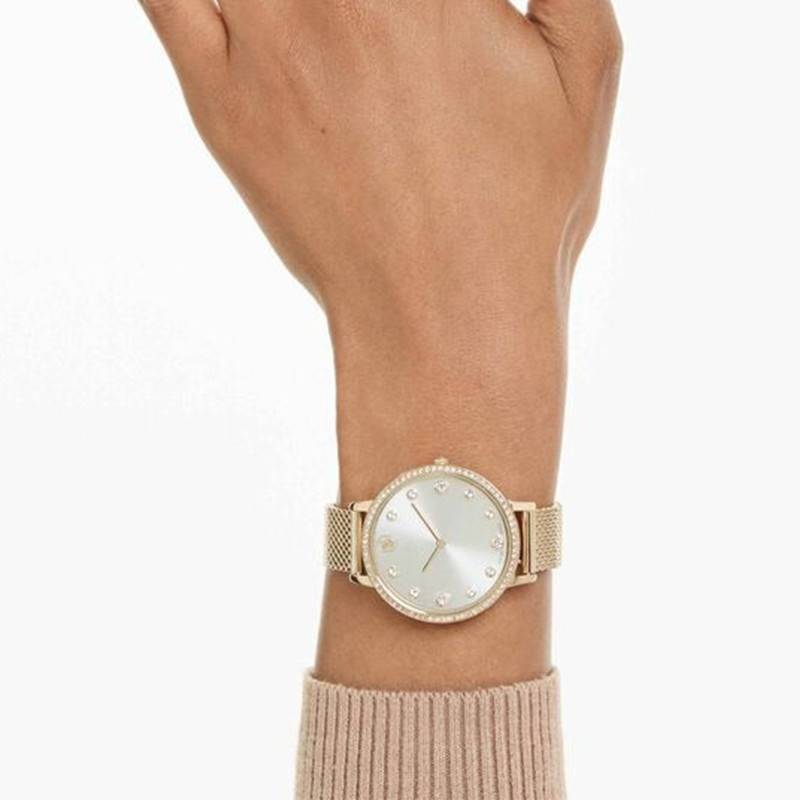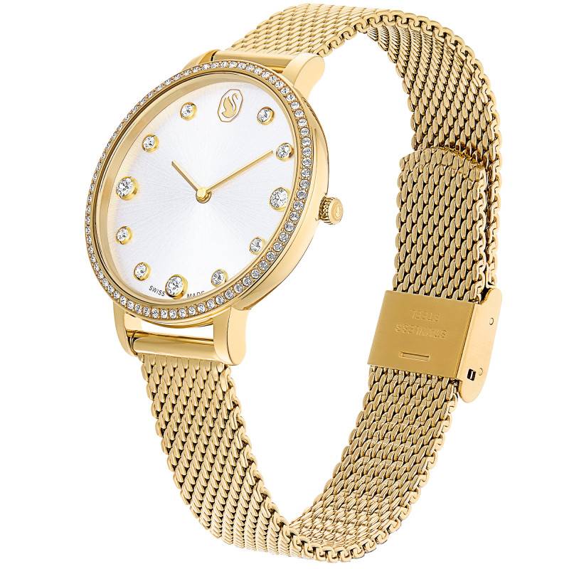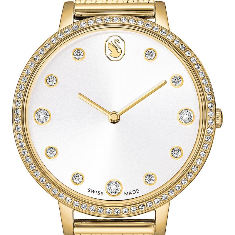 La montre Clarica Gold de Swarovski incarne l'élégance et le raffinement. Conçu en Suisse, ce garde-temps offre une qualité horlogère reconnue et une allure prestigieuse. Le boîtier rond de 35 mm, façonné en acier inoxydable, dispose d'une finition PVD jaune qui capture la lumière avec éclat. Sa robustesse est renforcée par un verre minéral protégeant le cadran, tandis que son fond emboîté assure une étanchéité parfaite jusqu'à 5 ATM. Le design est sublimé par la présence de cristaux Swarovski ornant la lunette, accentuant son allure luxueuse.