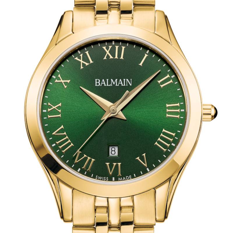 Le cadran de la Classic R Lady est un véritable chef-d'œuvre artistique, sublimé par une finition soleillée qui capture magnifiquement la lumière. De teinte verte, il contraste avec élégance contre le boîtier jaune, apportant une touche de fraîcheur et de sophistication. Les chiffres romains offrent une lisibilité optimale, tandis que le guichet date à 6 heures ajoute une fonctionnalité pratique sans perturber l'esthétique équilibrée du cadran. Le chemin de fer des minutes, finement dessiné autour des index, affirme la précision et enrichit le savoir-faire horloger de Balmain.
