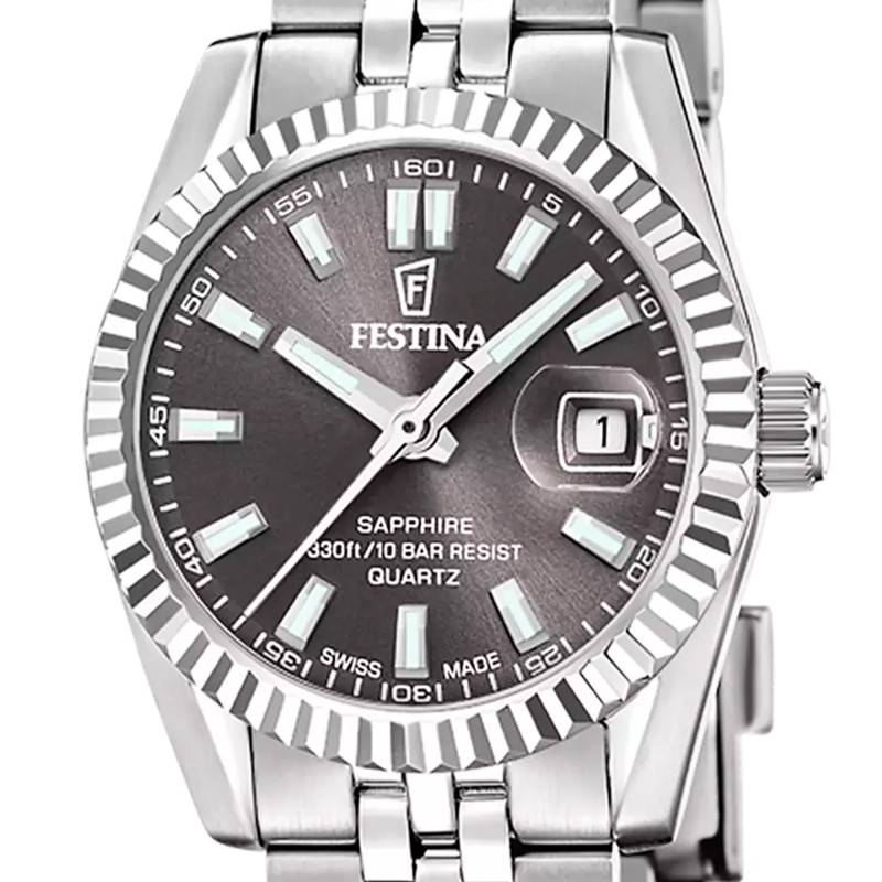 La montre Festina Swiss Made est un symbole de l'élégance féminine moderne, conjuguant à la perfection style et fonctionnalité. Son boîtier rond en acier inoxydable 316L, réputé pour sa robustesse et sa résistance à l'usure, offre un diamètre de 29 mm et une épaisseur de 9,50 mm, un format idéal pour souligner le raffinement d'un poignet féminin. Le poids total de 74 g confère une agréable présence sans être excessif. La finition polie de l'acier apporte un éclat subtil qui rehausse l'ensemble de l'esthétique. De plus, le verre saphir plat, considéré comme la meilleure option en horlogerie, protège le cadran tout en apportant une clarté exceptionnelle. Le fond vissé garantit non seulement une sécurité supplémentaire à l'intérieur de la montre mais renforce également son étanchéité. La couronne vissée renforce davantage cette étanchéité, ajoutant une couche de protection essentielle contre l'usure.