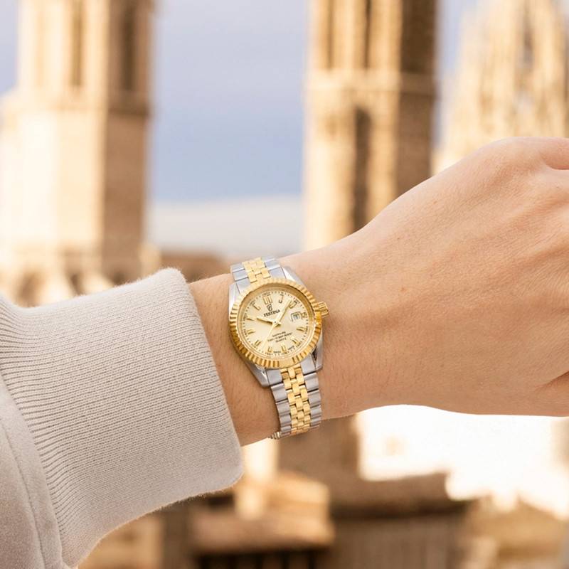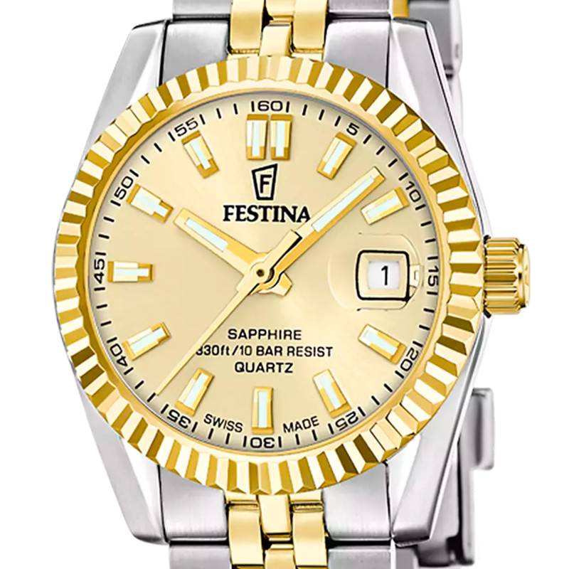 La montre Festina Swiss Made que nous vous présentons ici est une pièce horlogère dédiée aux femmes qui apprécient l'élégance intemporelle associée à la performance suisse. Le boîtier rond, d'un diamètre de 29 mm et d'une épaisseur de 9,50 mm, est fabriqué en acier inoxydable 316L, reconnu pour sa robustesse et sa résistance exceptionnelle à la corrosion. Ce mélange de gris et jaune offre une esthétique bicolore sophistiquée, parfaite pour toutes les occasions. La montre bénéficie d'une architecture soignée avec un fond vissé, garantissant une étanchéité optimale à 10 ATM. La résistance est un maître mot ici, notamment grâce au verre saphir qui recouvre le cadran. Dotée d'une couronne vissée, elle enveloppe une simplicité pratique dans un cadre de luxe. Son poids total de 78 grammes en fait une alliée légère.