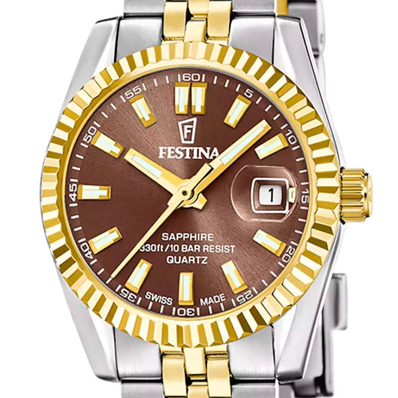 Le cadran de cette superbe montre Festina est un véritable spectacle pour les yeux. Arborant une teinte marron, il est orné d'index luminescents qui offrent une brillance subtile et une lisibilité parfaite, même dans des conditions de faible éclairage. Ces indices, associés à un chemin de fer délicat, structurent le cadran en un ensemble harmonieux. Le verre saphir plat qui le protège est le matériau par excellence pour sa résistance aux rayures. Un guichet date bien placé rehausse la fonctionnalité du cadran sans compromettre son esthétique épurée, tandis que les aiguilles dorées abordent une forme classique qui sublime le design général.