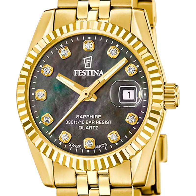 La montre pour femme de la prestigieuse marque Festina Swiss Made incarne le luxe et l'élégance dans chacun de ses détails. Son boîtier parfaitement rond en acier inoxydable 316L de couleur jaune offre une combinaison parfaite de durabilité et de raffinement. Avec un diamètre de 29 mm et une épaisseur de 9,5 mm, cette montre assure une présence délicate au poignet tout en apportant une touche de sophistication. La couronne vissée située à droite du boîtier permet de régler facilement l'heure et la date, tout en assurant une sécurité renforcée contre l'eau grâce à son fond de boîte vissé.