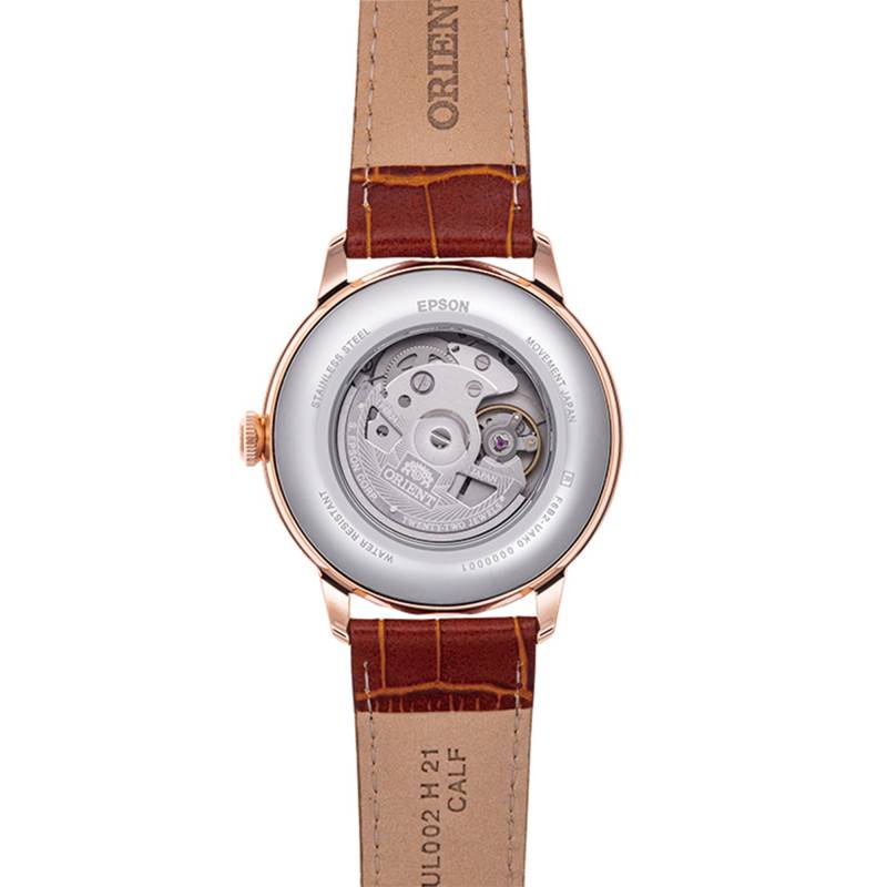 Fondée en 1950, la marque incontournable Orient présente à tous les amoureux de l'horlogerie une sélection éblouissante et diversifiée de garde-temps performants, raffinés et modernes qui respectent les standards de la haute qualité. Pour cette manufacture japonaise : chaque seconde est précieuse. Cela implique une attention particulière au détail, un choix rigoureux des matières et un savoir-faire unique, faisant de chacun de ses modèles le compagnon fidèle de tous les jours. Issue de la collection Classic, cette magnifique montre Sun & Moon RA-AK0801S sera le choix idéal de tout homme qui souhaitent se démarquer. Fabriquée avec la plus grande délicatesse dans un soin minutieux de détail, elle saura devenir une fois acquise votre indispensable du quotidien qui vous accompagnera dans vos plus belles aventures en habillant élégamment votre poignet et en vous offrant une lecture temporelle fluide. Son boîtier rond est fabriqué en acier inoxydable et mesure 41,50 mm de diamètre et 47 mm de longueur avec une épaisseur de 14,20 mm, des dimensions bien pensées pour un confort optimal. Agréable à porter, il est doté d'un sublime ton rose doré accordant à la montre une touche délicate. Un verre minéral passe par-dessus le cadran et une couronne crantée prend place à 3h. Celle-ci vous aidera à régler manuellement les heures, les minutes, la date et le jour. Au verso, le fond emboîté assurera une étanchéité de 3 ATM. Transparent, il vous permettra d'admirer les rouages de la montre à tout moment.