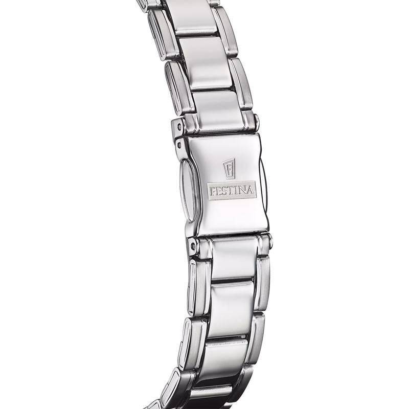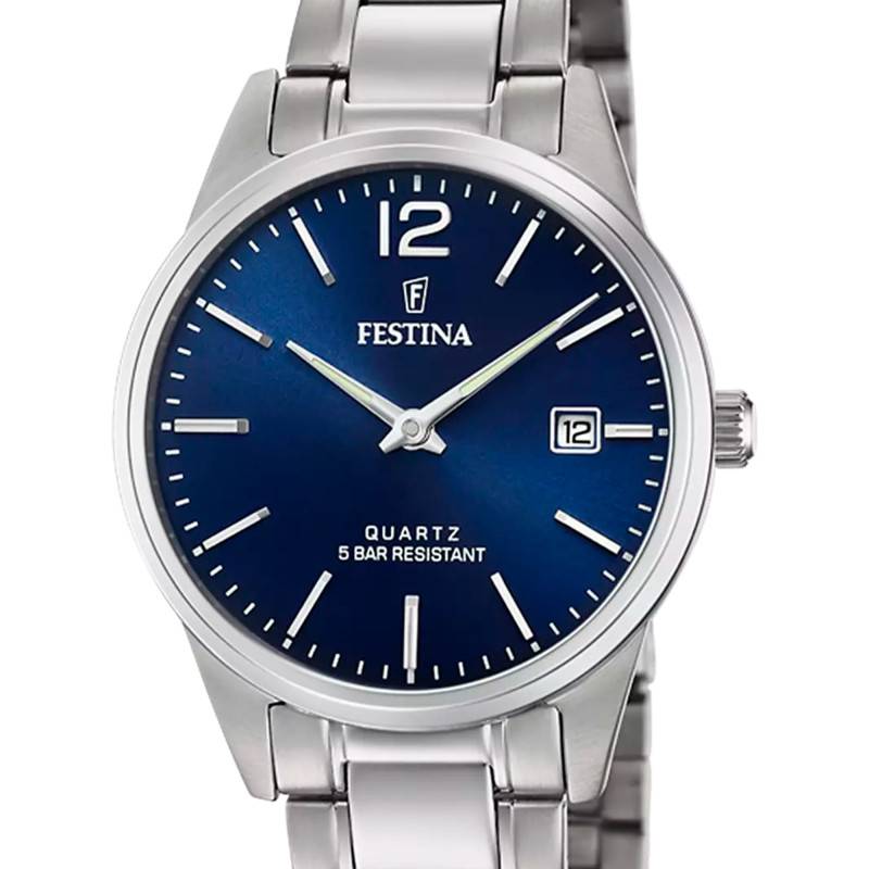 De couleur bleue et de finition soleillée, ce cadran captive le regard par sa brillance. Mis en avant par des indicateurs gris, il vous communiquera le temps avec facilité. Son centre présente deux aiguilles recouvertes d'un traitement luminescent qui vous communiqueront les heures et les minutes même dans l'obscurité. Elles pointent le chiffre arabe à 12h ainsi que les index bâton marquant les heures par la petite et le chemin de fer des minutes par la grande. Pour plus de précision sur le temps, un guichet date de fond blanc prend place à 3 heures. Enfin, Festina appose son logo et son nom sous 12h en guise de signature.