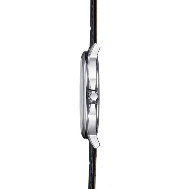 La sobriété de ce modèle se poursuit jusqu'au bracelet. En effet, celui-ci se présente sous la forme d'un bracelet en cuir noir. Sa surface adopte un relief semblable à la peau d'un alligator, apportant du contraste à l'ensemble. De plus, des surpiqûres ton-sur-ton habillent les extrémités. Notez que son entre-corne mesure 20 millimètres et qu'une boucle ardillon lui sert de fermoir.