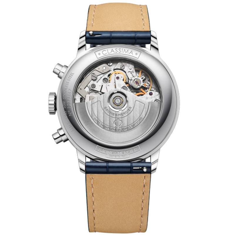 La prestigieuse maison horlogère Baume & Mercier est réputée mondialement pour son savoir-faire ancestral et pour la haute qualité irréprochable de ses gardes-temps. Dans sa collection Classima, la maison propose des modèles très élégants et intemporels. Le sublime garde-temps présenté ici est issu de cette collection. Il se dote d'un boîtier rond mesurant 42 millimètres de diamètre et 13,25 millimètres d'épaisseur. Ce dernier, en acier inoxydable, est de couleur grise et est surplombé par un verre en saphir qui lui donne l'avantage d'être robuste mais également résistant aux rayures. Le fond de boîte est emboîté et transparent. Cette montre vous propose donc une magnifique vue sur la précision du mécanisme en mouvement qui sera un régal des yeux pour tous les passionnés d'horlogerie. La couronne se loge à 3 heures et vous permet de remonter le mouvement horloger, tandis que deux boutons-poussoirs se situent à 2 heures et à 4 heures. Cette montre, se dotant d'un charme singulier, se posera sur le poignet masculin en lui apportant un raffinement et une parfaite élégance.