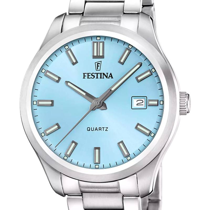 Plongez dans la beauté du cadran bleu clair de cette montre Festina. Doté d'une finition soleillée, il joue avec la lumière pour offrir des jeux visuels qui captivent. Les index et aiguilles luminescents assurent une lecture aisée même dans l'obscurité. Avec un affichage analogique classique, le cadran abrite également un guichet date, discrètement intégré pour maintenir la symétrie visuelle. Parfait pour suivre le temps avec style, le cadran conjugue fonctionnalité et élégance raffinée.