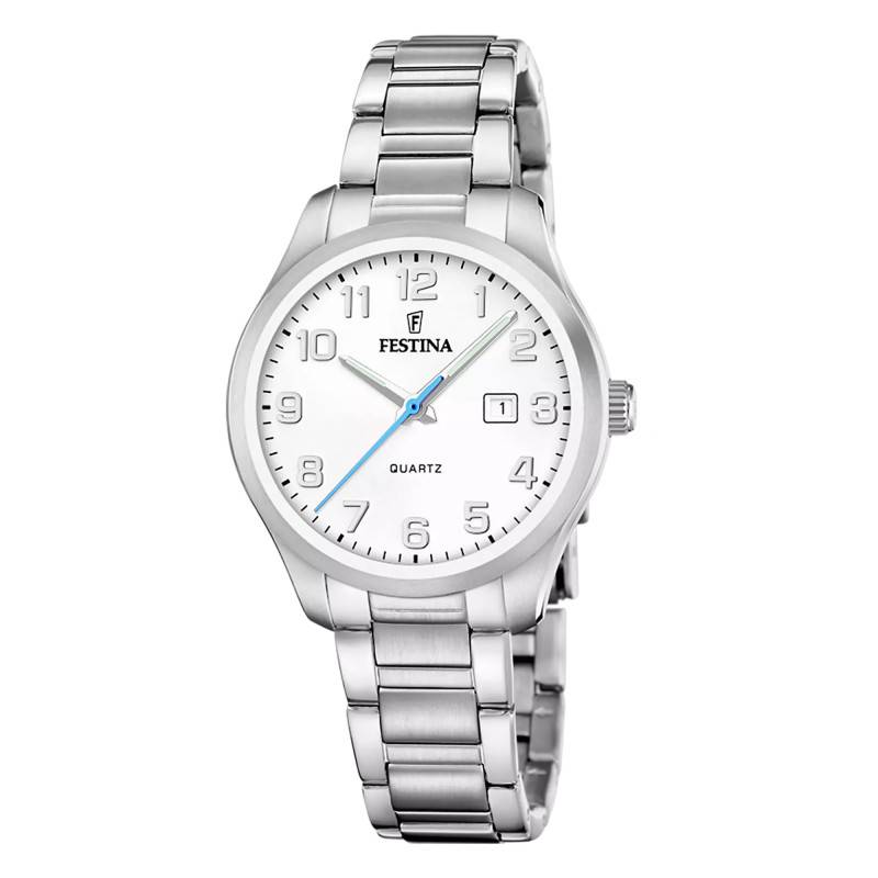 La montre est un exemple éclatant de la rencontre entre classique intemporel et technologie moderne. Cette pièce, signée Festina, se distingue par sa conception en acier inoxydable, synonyme de résistance et de durabilité exceptionnelles. Le boîtier rond, véritable classique en horlogerie, affiche un diamètre de 34 mm et une épaisseur de 8,8 mm, garantissant une présence délicate et élégante au poignet. Avec un poids de 73 grammes, elle offre un confort optimal sans compromettre le style. La finition mate (brossée/satinée) du boîtier renforce son allure sophistiquée, tandis que le verre minéral, connu pour sa robustesse, protège efficacement le cadran des aléas quotidiens.