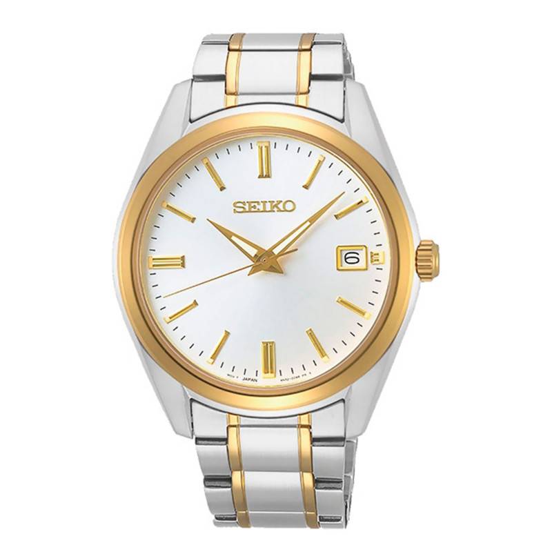 Un magnifique cadran de couleur blanc vient accueillir les détails dorés de qui vous permettront de lire l'heure. Vous trouverez au centre du cadran deux aiguilles et une fine trotteuse qui vous donneront les heures, les minutes et les secondes. Vous remarquerez que les aiguilles des heures et des minutes sont dotées d'un revêtement luminescent qui vous permettra de voir les aiguilles même dans l'obscurité. Des index dorés sont blanc" sur le contour du cadran. En forme de bâton, ils sont accompagnés d'un chemin de fer des minutes qui vous permettra de lire les heures de manière précise. Un guichet date trouvera sa place à trois heures et vous indiquera la date du jour. Pour finir, le nom Seiko viendra se placer sous l'index de midi.