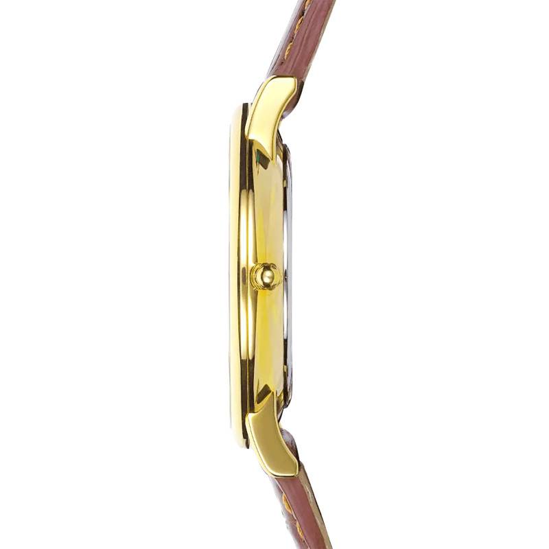 Dans sa vision de garder l'aspect classique de cette montre, ce modèle est muni d'un bracelet fait en cuir de veau qui se ferme avec une boucle ardillon. Sa couleur marron est en harmonie avec la teinte claire des surpiqûres.