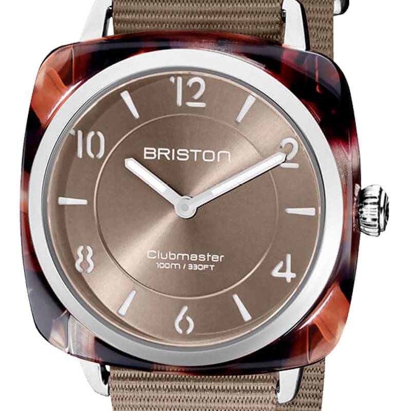 Née en France en 2012 d'une inspiration "British", la Maison horlogère Briston imagine des montres contemporaines, chic et décontractées. C'est avec cet esprit et cet ADN que la collection Clubmaster Chic Acétate a vu le jour. Le nouveau membre de la collection, la montre21536.SA.UGW.29.NGW est élégante et épurée. Elle arbore un boîtier coussin en acétate de cellulose. Ses dimensions sont particulièrement féminines et délicates avec ses 36 mm de long et de large pour une épaisseur de 9,2 mm. Son motif écaille apporte une touche d'élégance à cette montre et s'accorde parfaitement avec le cadran taupe. Ce dernier propose un affichage analogique du temps via deux aiguilles et des index luminescents avec un revêtement Super-LumiNova. Afin de préserver les indicateurs du temps des dangers extérieurs du quotidien, le cadran est surplombé par un verre minéral de qualité. La couronne remontoir prend place à 3 heures pour vous permettre le réglage de l'heure. Finalement, le fond de boîte vissé de ce garde-temps lui offre une étanchéité de 10 ATM.