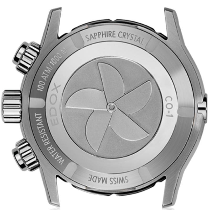 Plongez à la découverte des mystères des océans avec la montre 10242-TIN-BUIN présentée par la maison horlogère suisse Edox. Avec ce modèle au poignet, les abysses n'auront plus de secrets pour vous. Alliant un design sportif et contemporain, ce bijou horloger est destiné à la gent masculine. Conçu en titane, le boîtier de forme ronde mesure 45 millimètres de diamètre pour 16 millimètres d'épaisseur. Il s'accompagne d'une lunette unidirectionnelle en céramique. De couleur noire, elle est graduée par des chiffres arabes blancs et possède un compte a rebours visuel blanc ainsi qu'un marqueur luminescent positionné à midi. Par ailleurs, cette lunette prend place autour d'un robuste verre saphir. Réputé en horlogerie pour sa résistance extrême face aux rayures, il recouvre le cadran afin de préserver son élégant design. Vous pourrez régler l'heure et la date à l'aide de la couronne remontoir vissée placée à 3 heures. Cette dernière est entourée de deux boutons-poussoirs qui vous permettront d'utiliser la fonction chronographe de ce petit bijou. De l'autre côté, à 9 heures se trouve une valve à hélium. Indispensable aux montres de plongée et particulièrement durant la phase de décompression, elle permet d'évacuer les fines particules d'hélium qui s'introduisent dans le boîtier afin de préserver ce garde-temps. En effet, avec un fond de boîte vissé, ce modèle vous garantit une étanchéité de 1000 mètres de profondeur. De quoi explorer les fonds marins en votre compagnie !