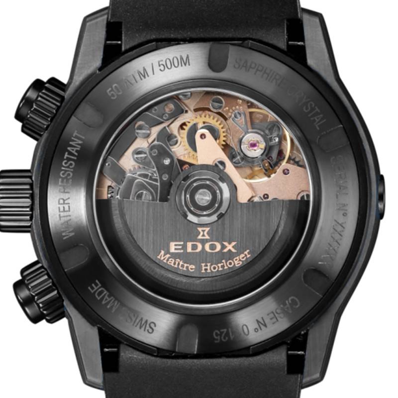 Le cœur technique de la montre est le puissant mouvement Sellita SW-500, célèbre pour sa fiabilité et sa performance. Ce mécanisme automatique décoré présente une fréquence de 28.800 A/h, assurant un battement précis des aiguilles et garantissant ainsi une mesure du temps fiable. Doté d'une réserve de marche de 48 heures, ce calibre suisse illustre l'expertise technique qui a fait la réputation de l'industrie horlogère suisse. Fidèle à son engagement envers la qualité, Edox offre une montre capable d'une ample autonomie fonctionnelle, simplifiant la vie quotidienne de son porteur.