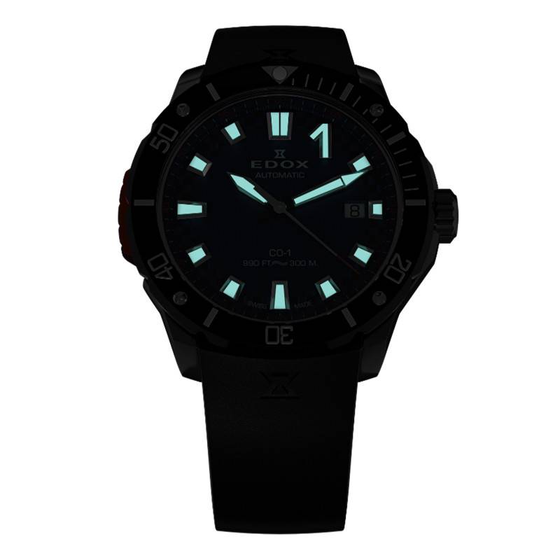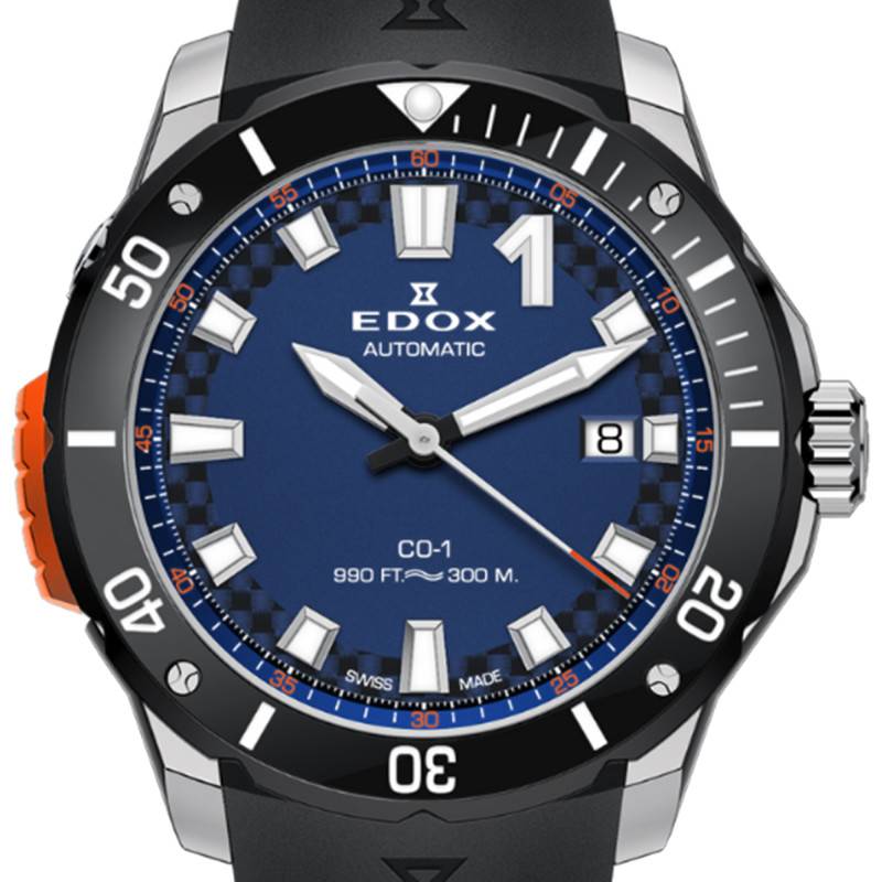 Le cadran de la montre Edox CO-1 Date Automatic impose son allure par une finition mat d'un bleu profond qui capte et joue subtilement avec la lumière ambiante. Les aiguilles sont agrémentées de traitement SuperLuminova, offrant une lisibilité optimale même dans l'obscurité totale, garantie laquelle l'héritage lumineux préserve l'éclat du jour. Les index, imposants et parfaitement contrastés, se détachent nettement sur le fond bleuté, facilitant une lecture rapide et intuitive de l'heure. À 3 heures, le discret guichet de date s'intègre harmonieusement, rappelant que sophistication rime avec utilité. L'ensemble est protégé par un verre saphir plat, inrayable, qui préserve le cadran des chocs et rayures.