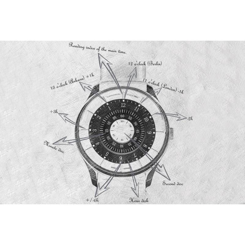 C'est une belle prouesse technique et esthétique que la marque allemande ! Grâce à ses 3 disques rotatifs, il indique les heures, les minutes et les secondes de 12 fuseaux horaires différents ! L'heure du lieu de votre résidence étant prévue pour être placée à midi. La lecture du temps se fait de la sorte : le grand disque blanc affiche les heures, le disque blanc de taille moyenne indique les minutes et le petit disque noir vous informe de l'écoulement des secondes. Chaque disque possède un chemin de fer et des chiffres arabes. Sur le pourtour du cadran, le cercle vert soleillé présente les 12 index bâton, en relief argenté. Ils sont fixes et représentent les 12 fuseaux horaires. Pour donner un exemple, lorsque vous lisez l'heure du lieu de votre résidence (index de midi), vous pouvez lire sur l'index de 1h le fuseau horaire où il est une heure de moins que chez vous. Grâce à la signature de la marque placée à midi, vous n'aurez aucune peine à retrouver l'index de midi. Enfin, notez que ce cadran précise à 6h la fabrication allemande de cette montre.