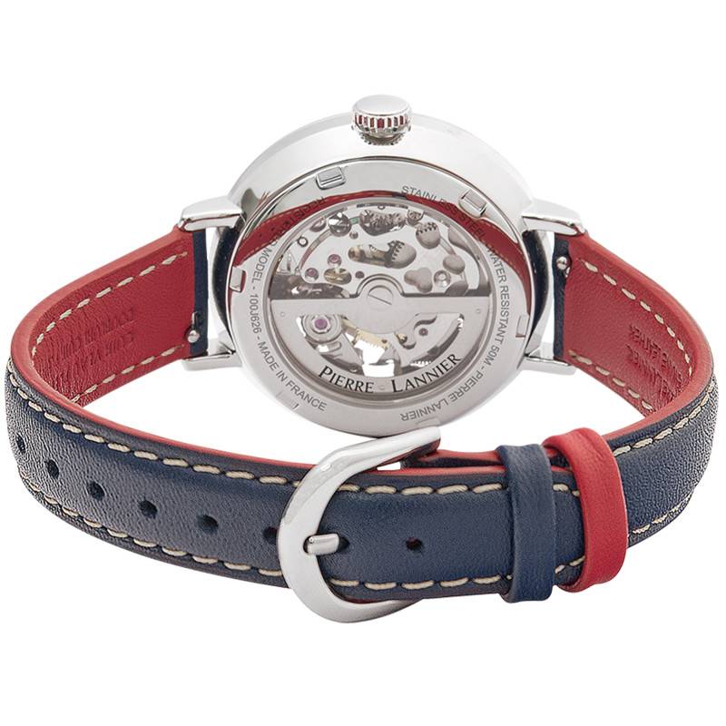 Ce modèle est mis en avant par son bracelet en cuir de bovin bleu. À la fois confortable et élégant, ce dernier présente des surpiqûres blanches apportant une touche raffinée et se marie parfaitement avec n'importe quelle tenue. Sa boucle ardillon argentée assure un maintien sécurisé. D'une longueur de 105/75 mm, ce bracelet mesure 14 mm de largeur.