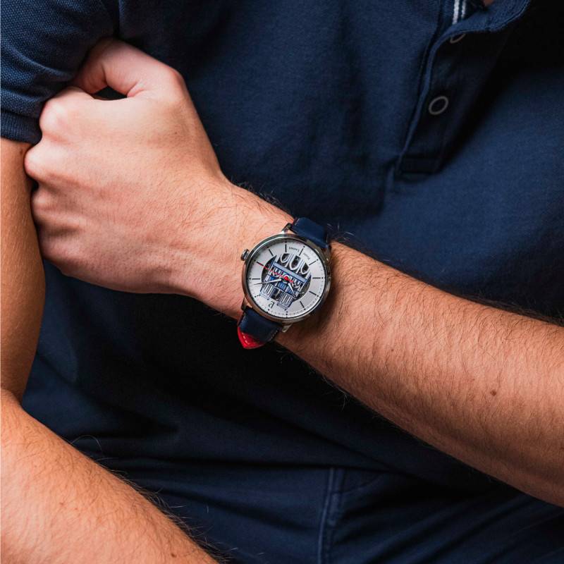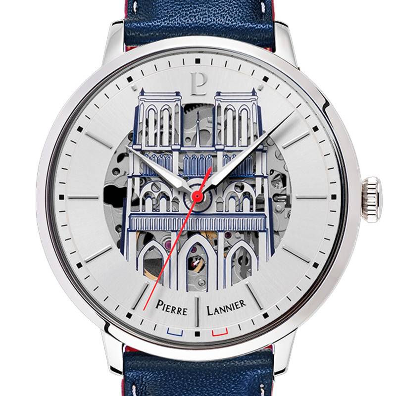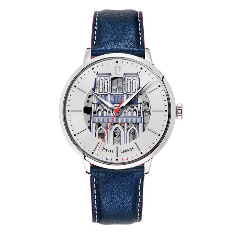Conférant originalité et distinction à ce garde-temps, ce cadran rond dévoile un design squelette et met en valeur une représentation en relief de la cathédrale Notre Dame de Paris. Son fond gris soleillé loge deux aiguilles luminescentes et une fine trotteuse rouge, indiquant les heures, les minutes et les secondes avec précision. Le pourtour présente un chemin de fer des minutes gradué par des traits noirs et accompagné d'index bâtons. Enfin, la marque signe sa montre par son logo sous 12 heures et son nom à 6 heures.